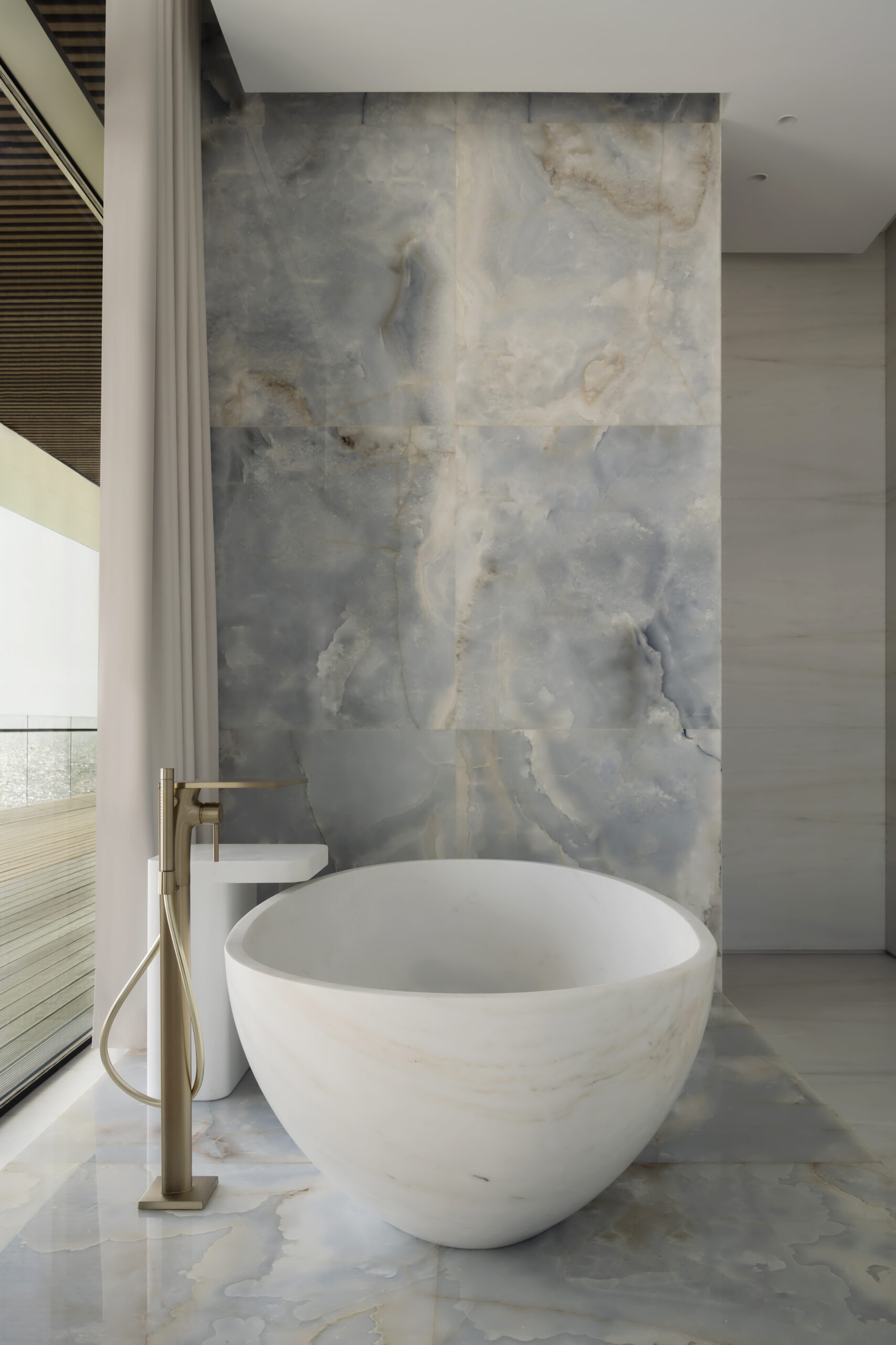 For the interior coverings, three dominant materials were used: grey Fior di Bosco marble and Verde Antigua marble that contrast with the Canaletto Walnut wood.