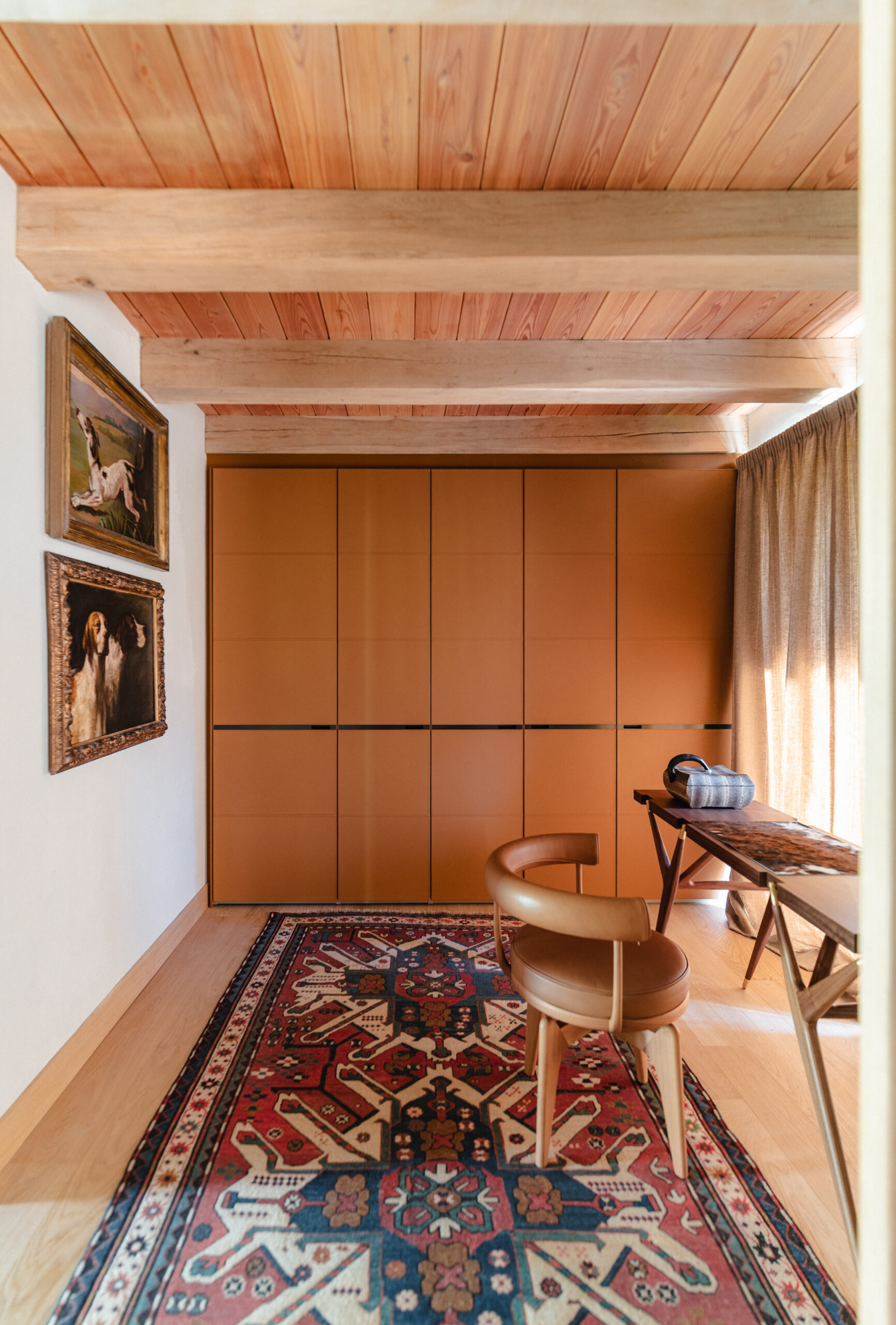 Moving toward the sleeping area, one can notice a transition to warmer tones and natural hues—browns and earth shades that make each space feel more welcoming and harmonious. The Poliform wardrobes in the small study/walk-in closet feature cognac and leather nuances, echoed by the Indochine armchair by Cassina and the Pa’ 1947 wooden console. The lighting point is provided by the Pascal floor lamp by Oluce.