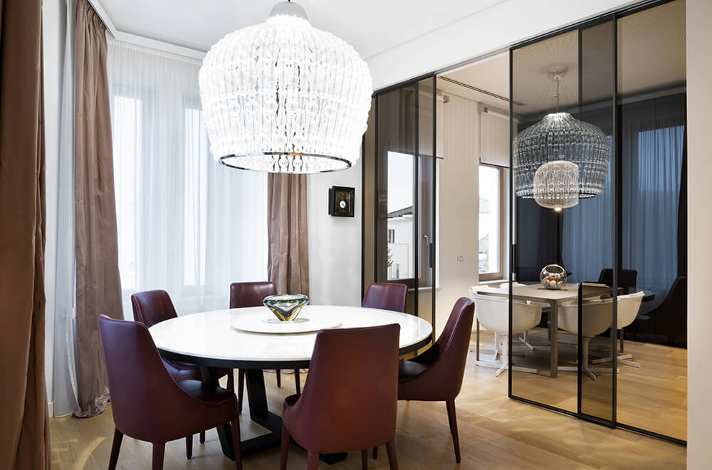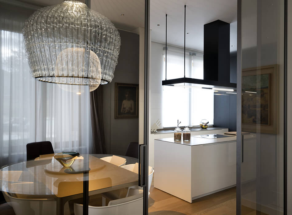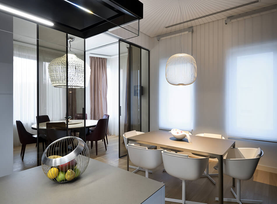 The large B&B Italia table surrounded by Febo chairs with high back seats up to ten diners. A dividing wall of Rimadesio sliding doors, ideal for separating spaces while keeping them visually communicating, divides this area from the Varenna furnished kitchen, with wood and lacquered finishes and dominated by a central island of great versatility.