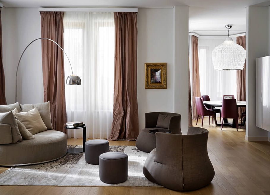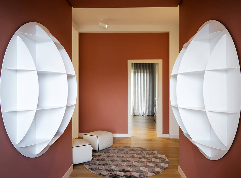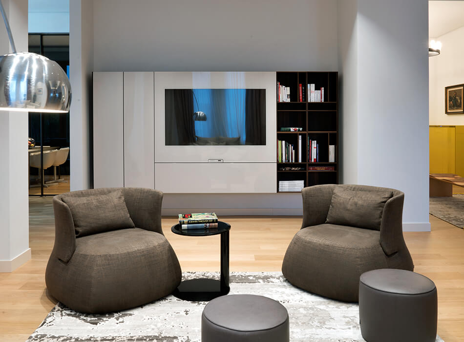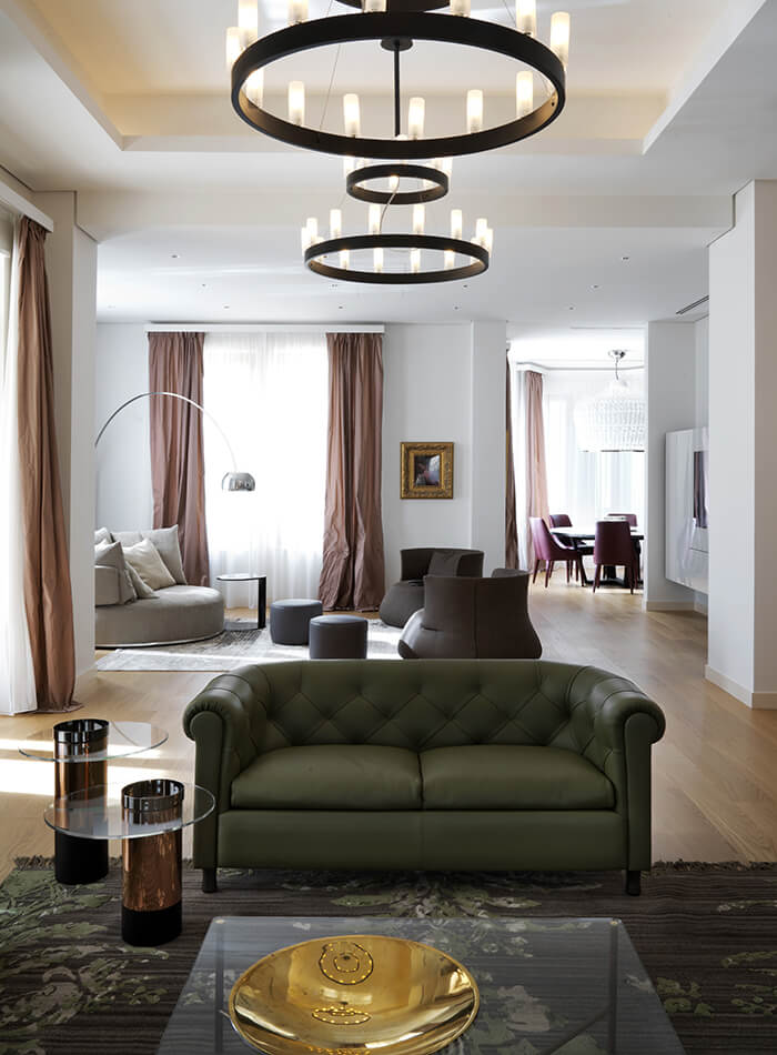 The living space was initially born as a single area, later divided to give room to a formal area suitable for the reception of guests and a more informal one reserved vice versa for the family and the entertainment of the children. The first formal space, dominated by a suspended display designed by Marco Piva from Salvioni Design Solutions, houses Poltrona Frau sofas and B&B Italia armchairs, flanked by precious Gallotti&Radice coffee tables. The welcoming atmosphere of the space is accentuated here by the Fontana Arte and Oluce lamps.