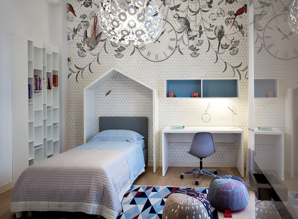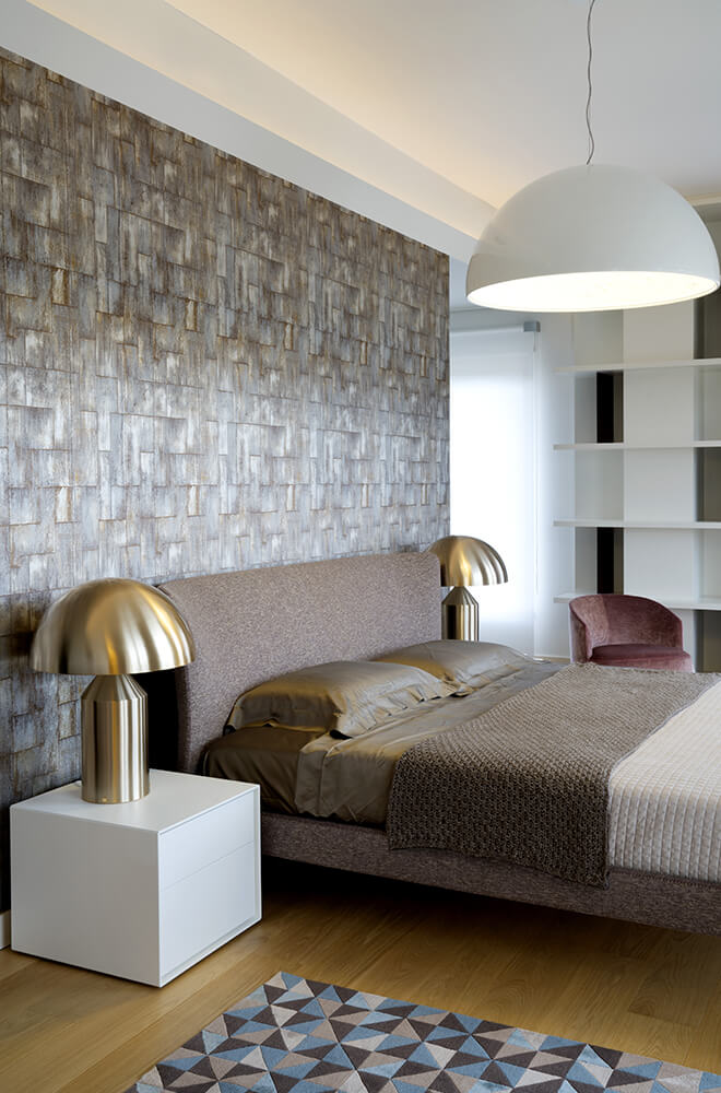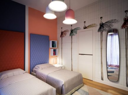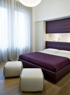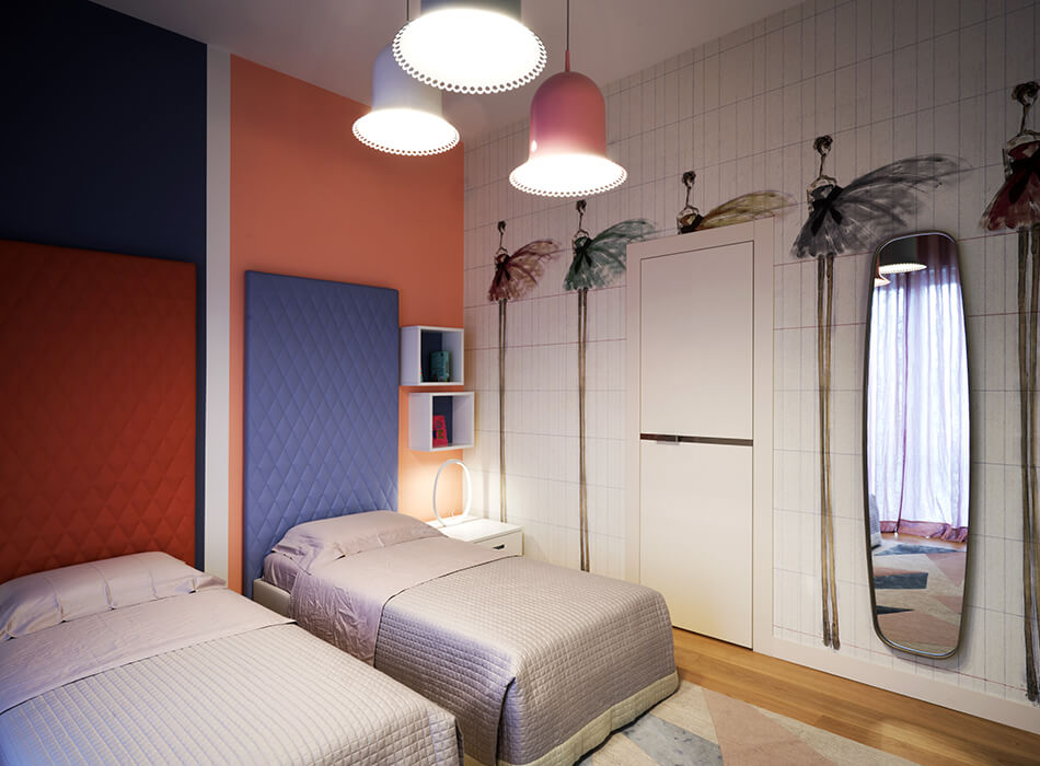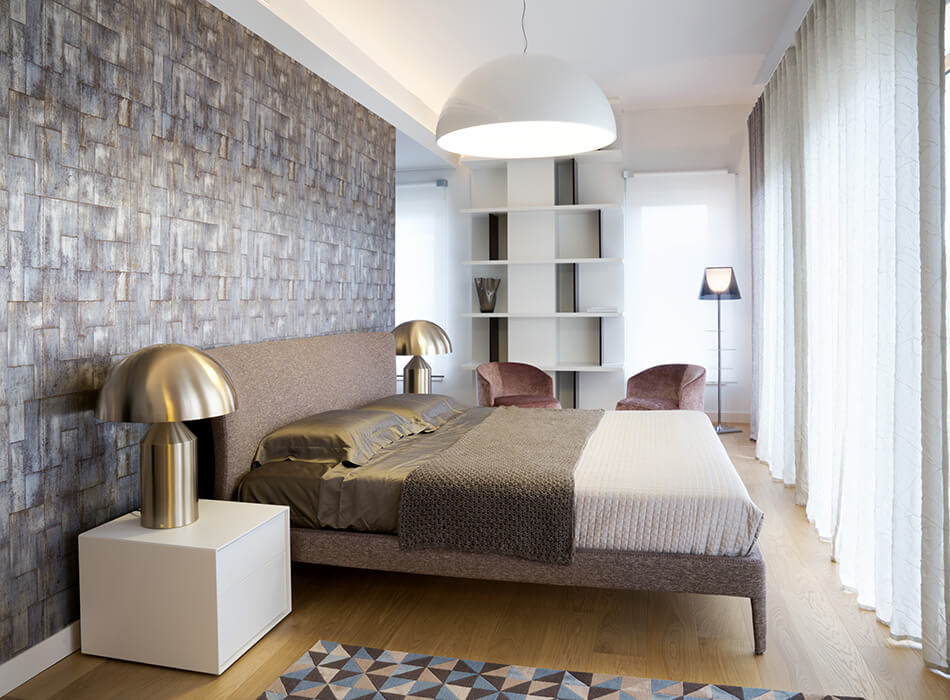 The bedroom area includes two guest rooms, two bedrooms and a large master bedroom from which is possible to enjoy the best view of the landscape of the entire villa. The first floor, reserved exclusively for the family, is distinguished by the choice of warmer colors and informal furniture, assorted according to the specific needs of each member of the family and supported by some custom-made pieces. Among the inevitable Poliform wardrobes, the choice of B&B Italia and Flou beds stands out also with the Erba Mobili desk, the Vitra chairs and MDF bookcases.