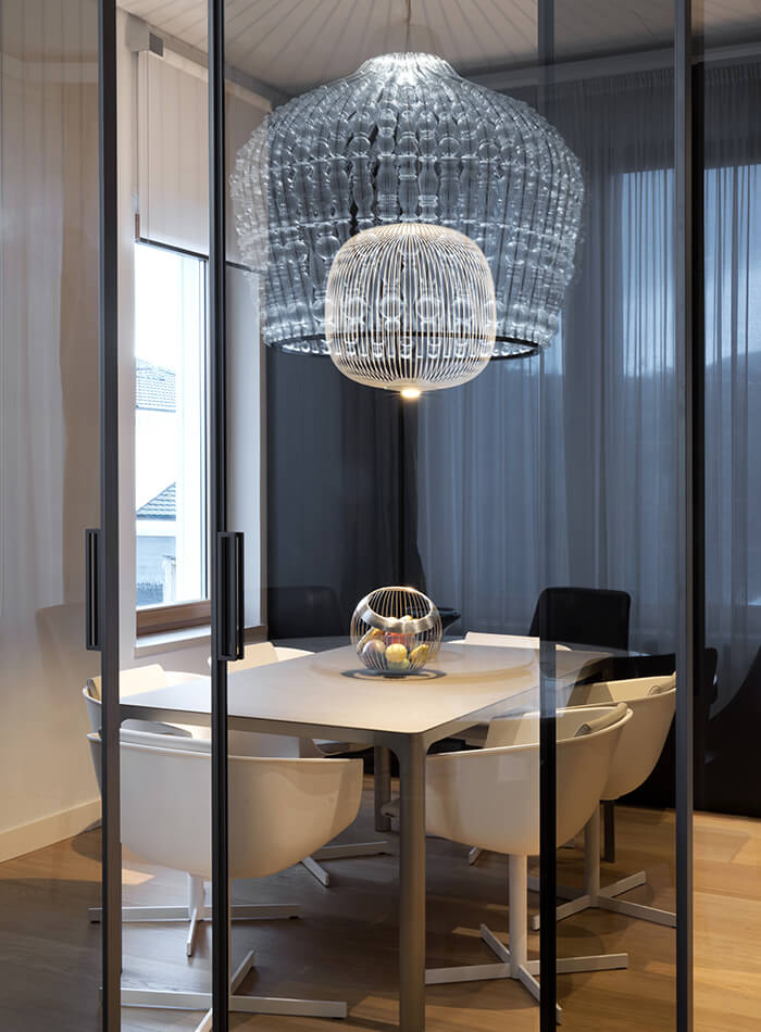 The family lounge has been deliberately furnished with voluminous and comfortable seats, such as the Amoenus armchair by Maxalto, perfect for hosting several people at the same time. The TV, hidden by the Acerbis system, integrates this space illuminated by Flos lamps. The front dining room was placed in an enchanting bow-window, full of windows and visual sights on the outdoor garden capable of making this convivial area particularly bright and airy.