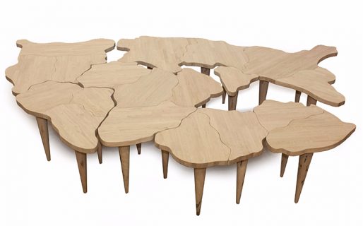 A more enjoyable interpretation is the Pangea table: a solid wood table composed of 19 pieces of different shape assembled, like a giant puzzle, with the idea of creating the ancient continent.