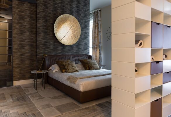 Upon entering, you find yourself observing an elegant bedroom dominated by the You and Me canopy by Ivano Redaelli. Not far away, the En bedside table by Fiam and the Kelly chest of drawers by Poliform. At the foot of the bed, an elegant relaxation area unfolds with an Amini rug, a Saint Germain sofa by Poliform and Ralph and Belt coffee tables by Meridiani. This composition supported by the Leon Battista wall mirror by Glas Italia acts as an antechamber to a private space in which a terracotta wall by Fornace Brioni develops, in front of which the Jasper desks by Meridiani and the Alma armchair by Flexform have been placed. The colors of the wall were designed to reflect the taste of the top and match the whole, demonstrating how ceramic walls can rightfully become one of the compositional elements of a space.