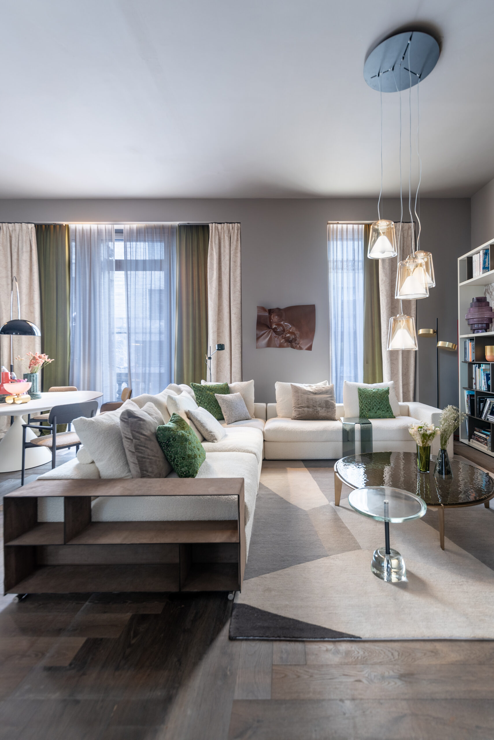 Entering the second space, you are welcomed by a Poliform kitchen space with Lio stools by Zanotta and the small table Comodo by Karakter that gradually fades into a dining area with Clay table by Desalto in white finish and Curve armchairs by Poliform. Further on, an area full of elements extends and dominated by the imposing Wall System bookcase by Poliform in marble finishes. In the same space, the Groundpiece sofa by Flexform and the DS 265 Coco armchair by de Sede coexist. Among the table proposals, it is necessary to mention the Halo small table by Fiam, Pina Low by Pulpo, Sengu by Cassina and York by Fiam. The Riflessi carpet by Amini closes the scene.