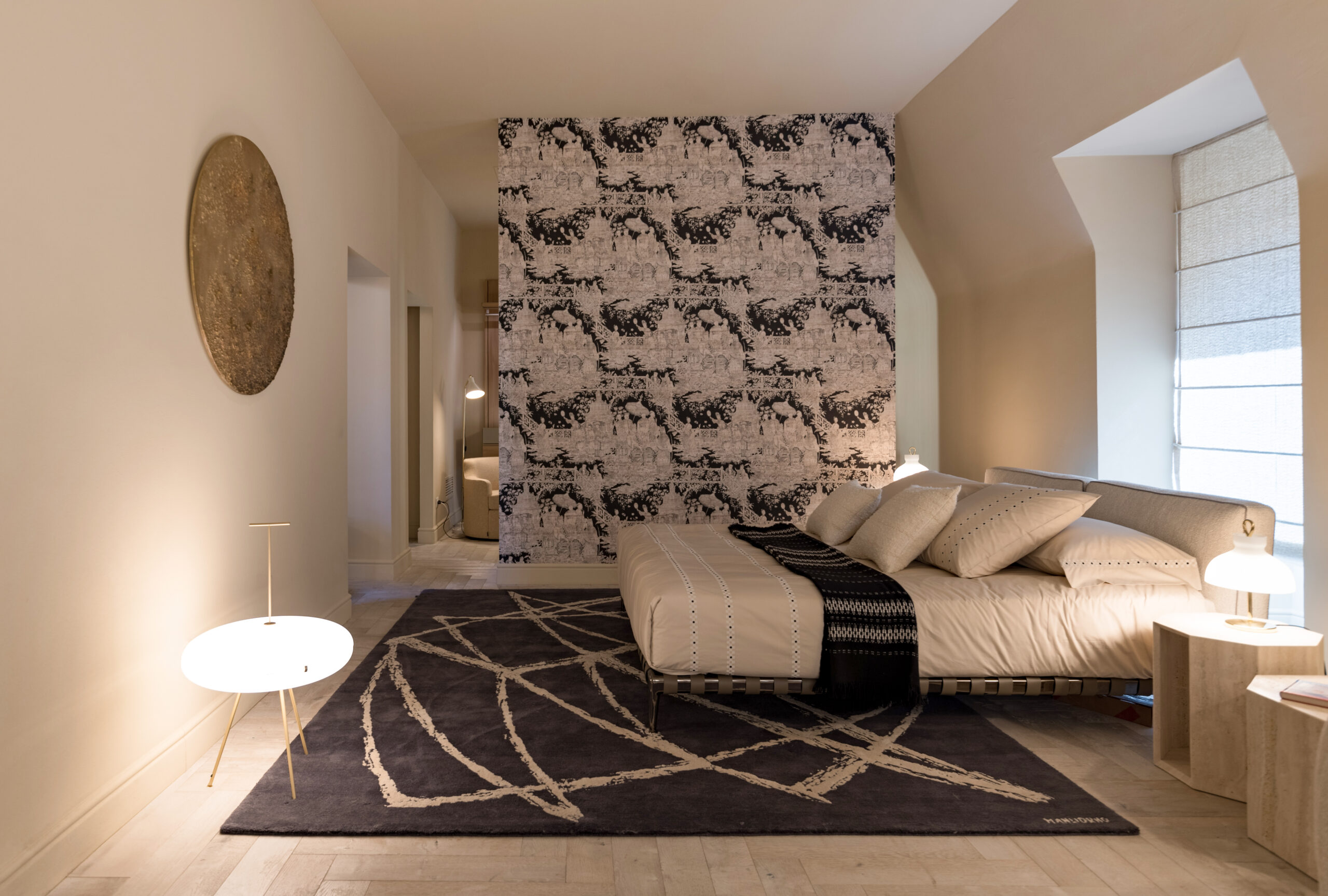 Elegant and romantic, this plan has found a further note of merit in the collaboration with the art and design hub 6499Milano thanks to the introduction of numerous works by prominent artists including Pablo Picasso with his engraving Senza titolo (1968) and Jacopo Mandich with his sculpture. The paintings by Paola Romano and Giuseppe Amadio are also suggestive.
