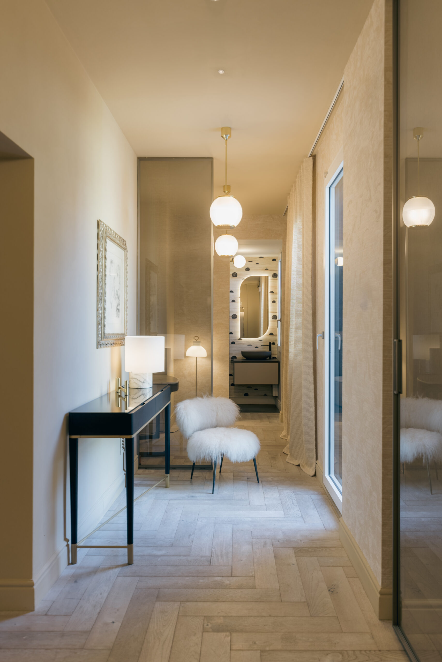 A large service corridor allows access to the two antoniolupi bathrooms, one more minimal and the other equipped with all comforts. The lighting was entrusted to Tato, a refined and retro brand dedicated to the re-edition of lamps by some of the great Milanese architects of the twentieth century such as Gio Ponti and Ignazio Gardella.