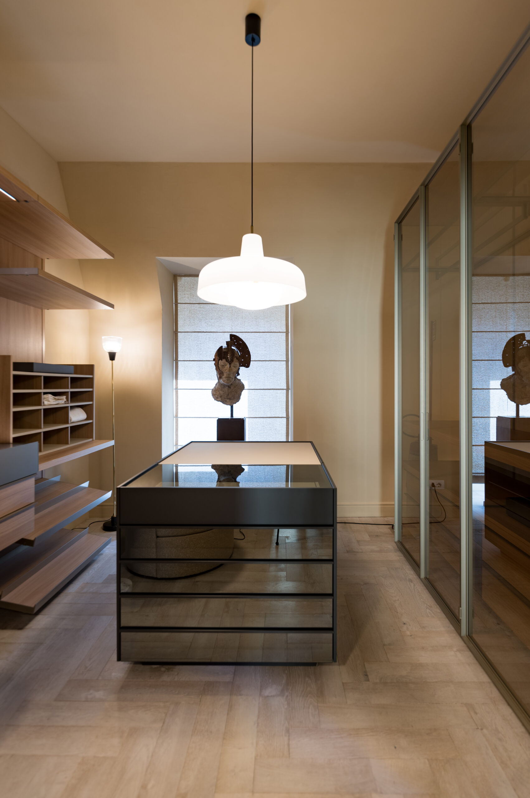 However, the true protagonist of this space is the sleeping area dominated by the Gregory bed by Flexform and flanked by a spacious walk-in wardrobe, ideal for those who love to dress in the name of comfort. In this beauty space, the Set Up chest of drawers by Poliform stands out, chosen in its darker shades to give a distinctive touch to the room.