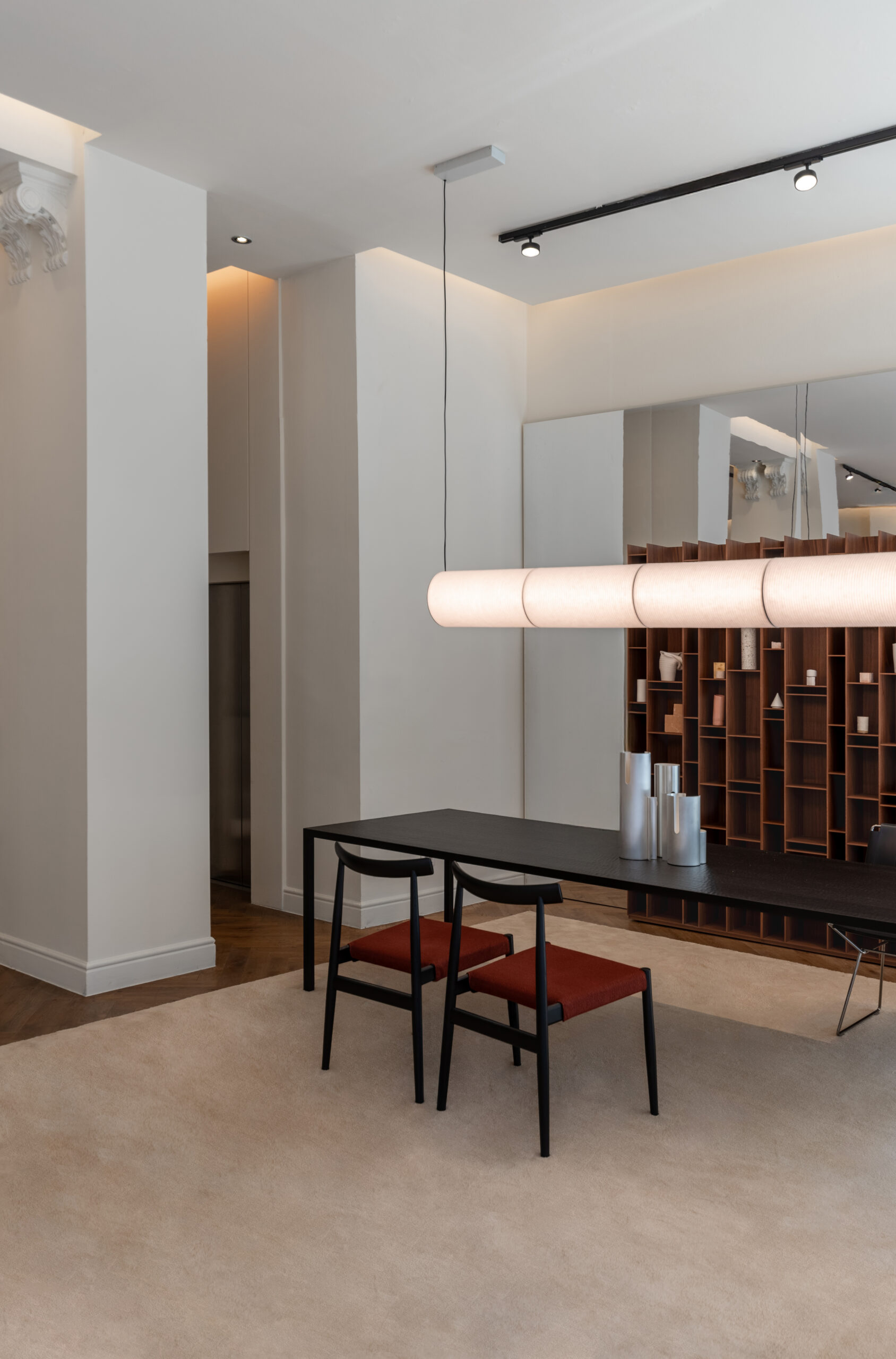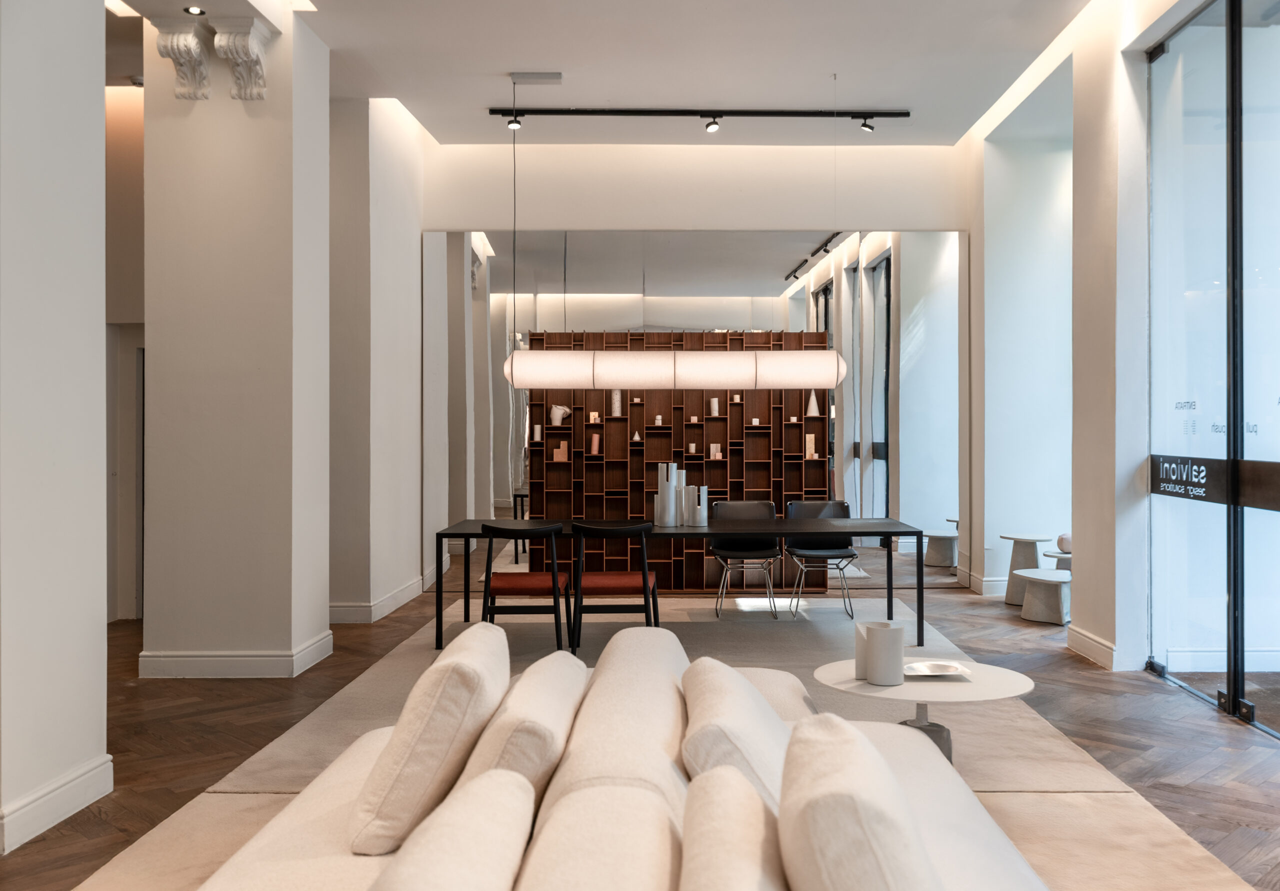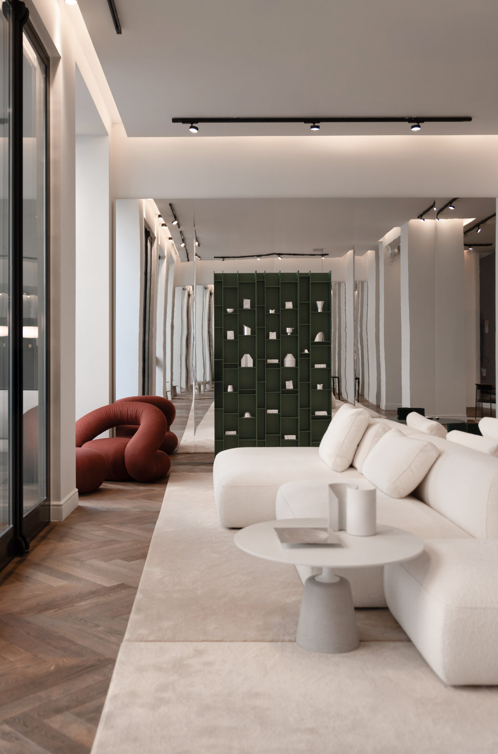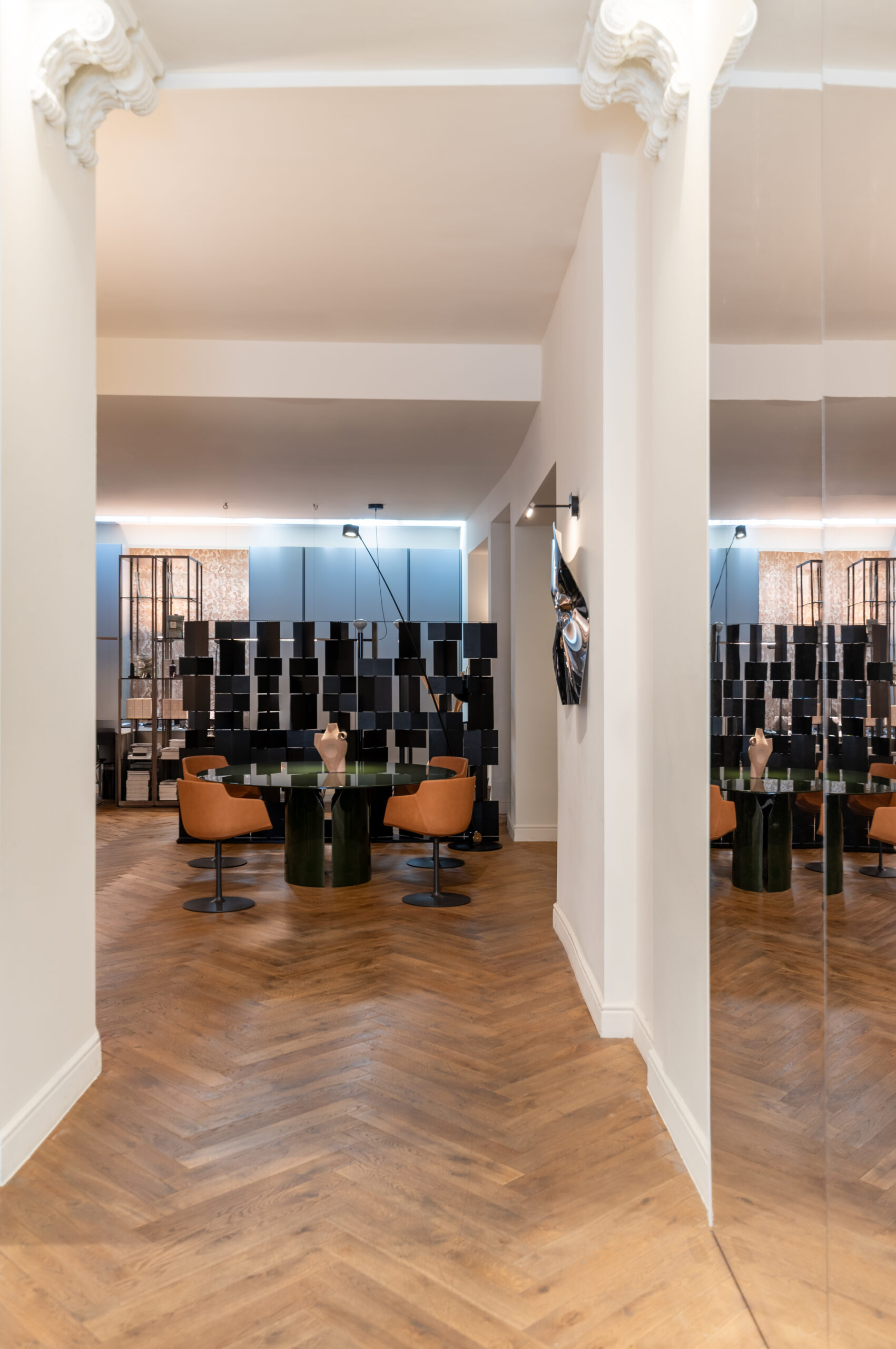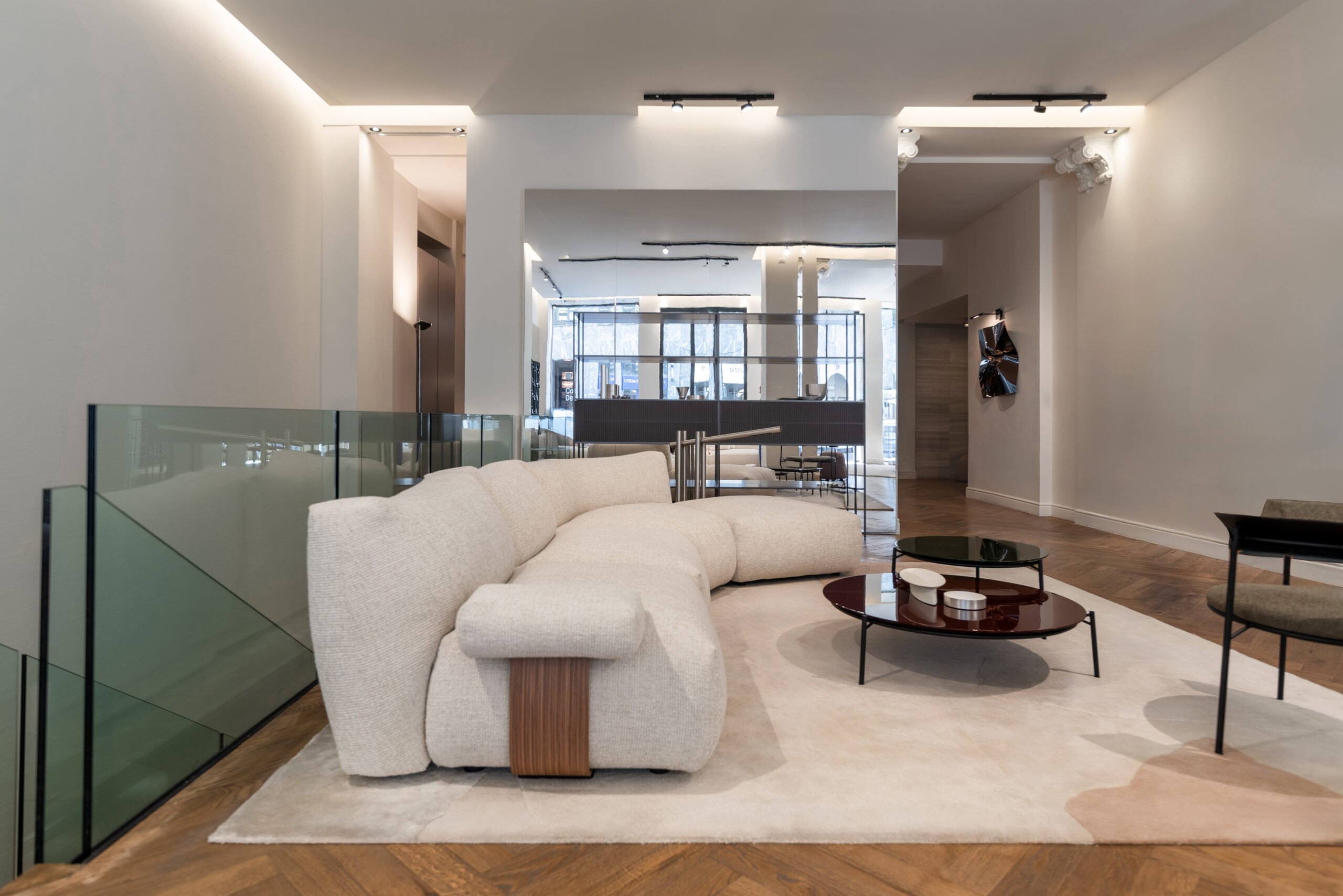The space is divided into three distinct areas: the first faces Via Durini, the second is set further inside, and the third is more secluded, bordering the showroom’s offices and separated by a practical black room divider.