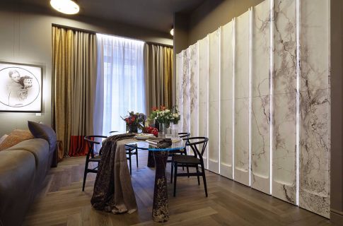 A classic material like marble is renewed and updated with the boiserie designed by Maurizio Di Mauro and exclusively produced by Con.Ca.Marmi for Salvioni Design Solutions. Inspired by the shape and style of Doric columns, characterized by deep concave vertical grooves, the architect Di Mauro aimed to recreate a single module that can be joined to infinity, like pilaster strips, in order to produce a classic, but at the same time unusual, façade.