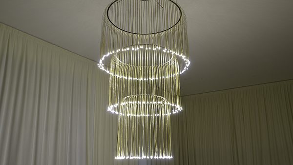 This variation of opacity amplified by the curvature of the surface interacts with the light interrupting its linearity, recreating a sculptural drape on the outer layer.