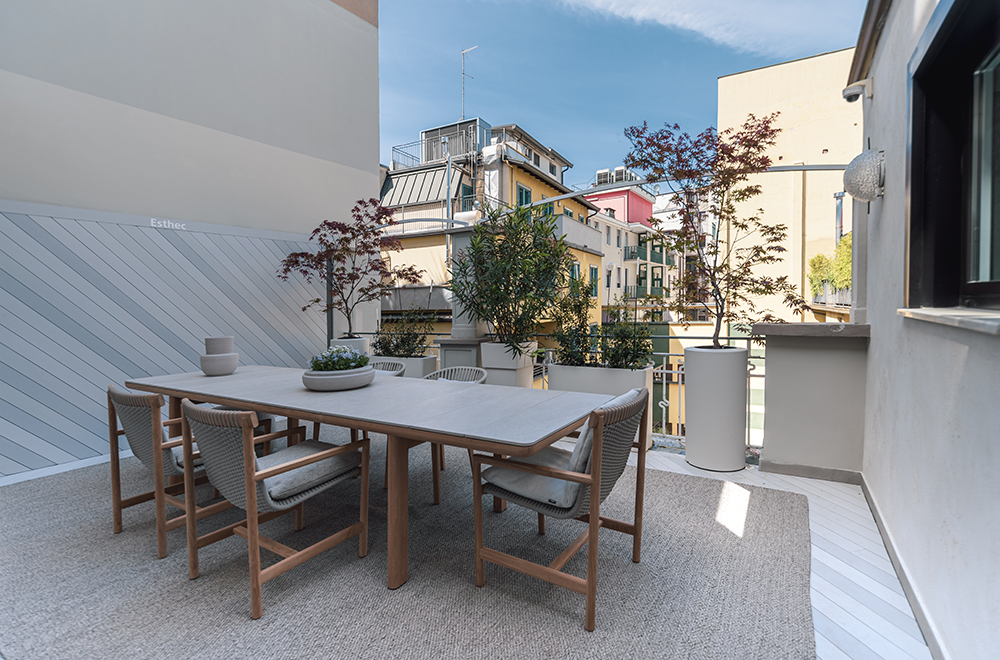 Indispensable for the creation of these incredible terraces was the contribution of the Esthec company and its flooring which has been able to give a touch of unmistakable beauty and quality on each floor. The Esthec company is known in the sector for the quality of the surfaces it offers, ideal for outdoor use and resistant to the most adverse weather conditions. Thanks to the collaboration with Salvioni Design Solutions, the company was able to enrich the Milan showroom with its unmistakable stylistic touch.