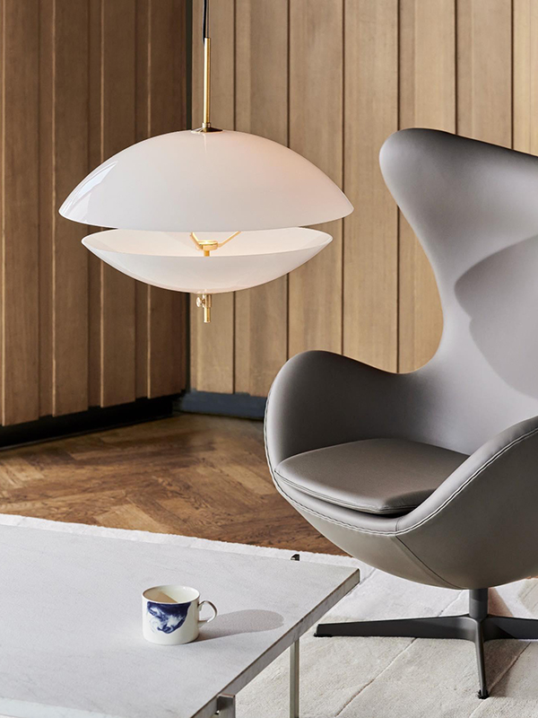 Fritz Hansen returns to amaze with the Clam pendant lamp in opal glass and brass. The particular “shell” shape inside reveals a pearl of light that is particularly pleasing to the eye.