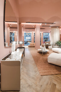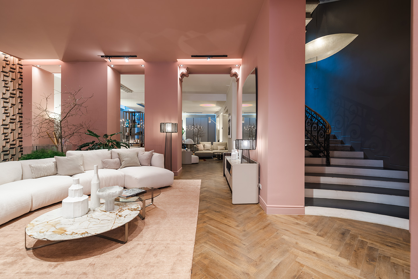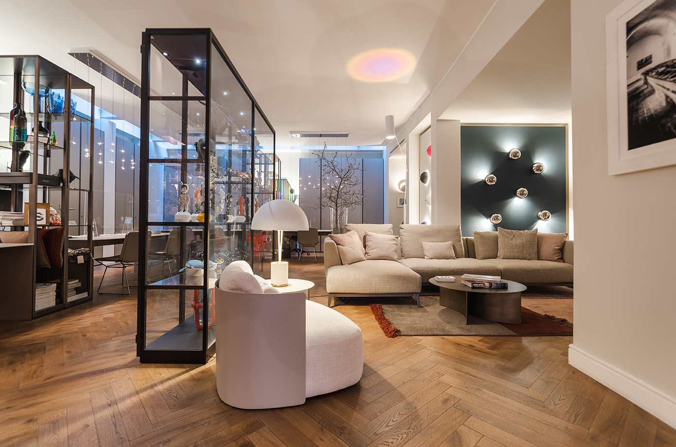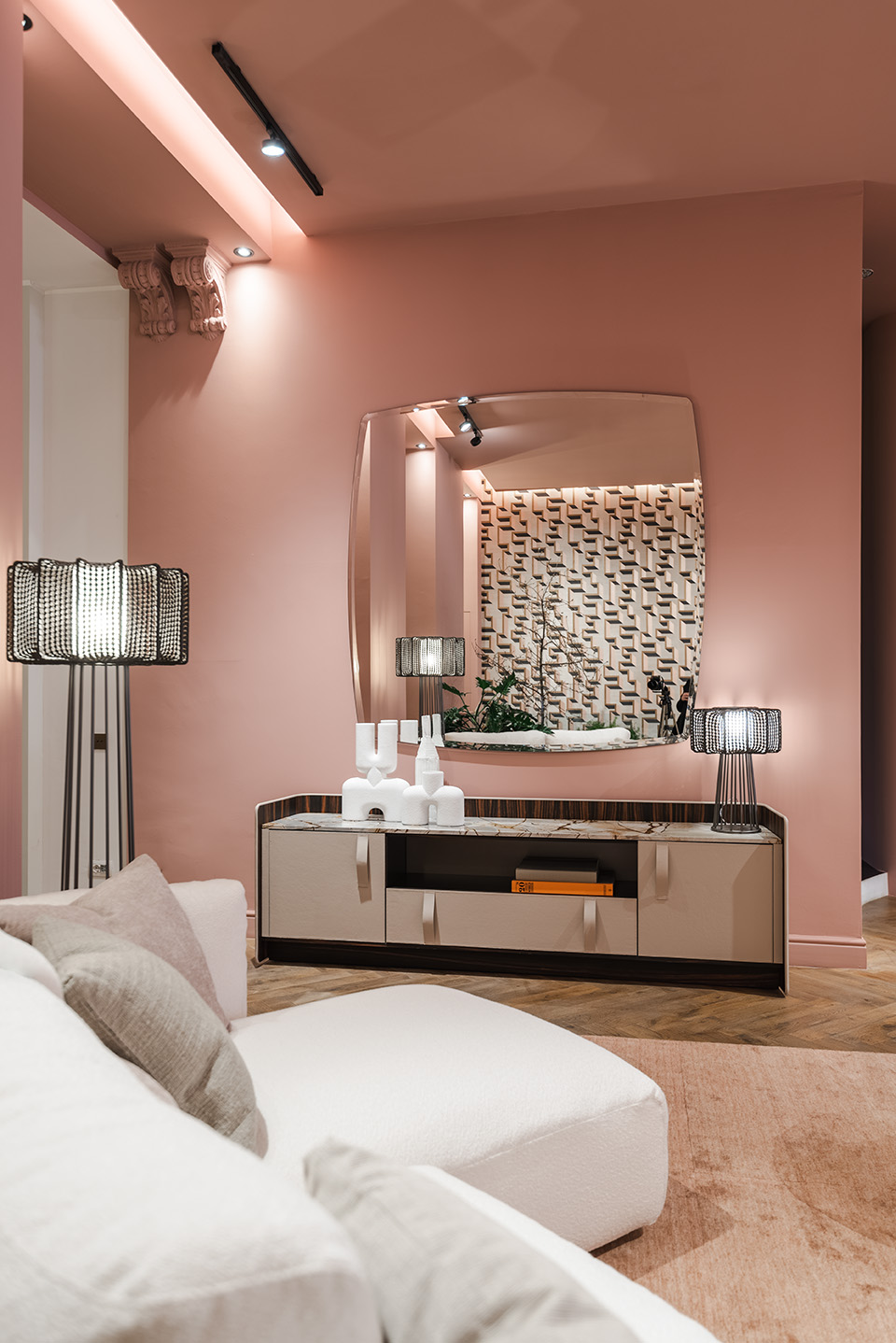 Procedendo verso l’interno il mood vira alle proposte living. I divani Fiocco e Olivier fungono da perfette cornici per questo allestimento moderno e genuinamente declinato fra marmi, ottoni, vetro e legni. Punte di diamante sono la console Iko e l’ampio specchio Olivier.