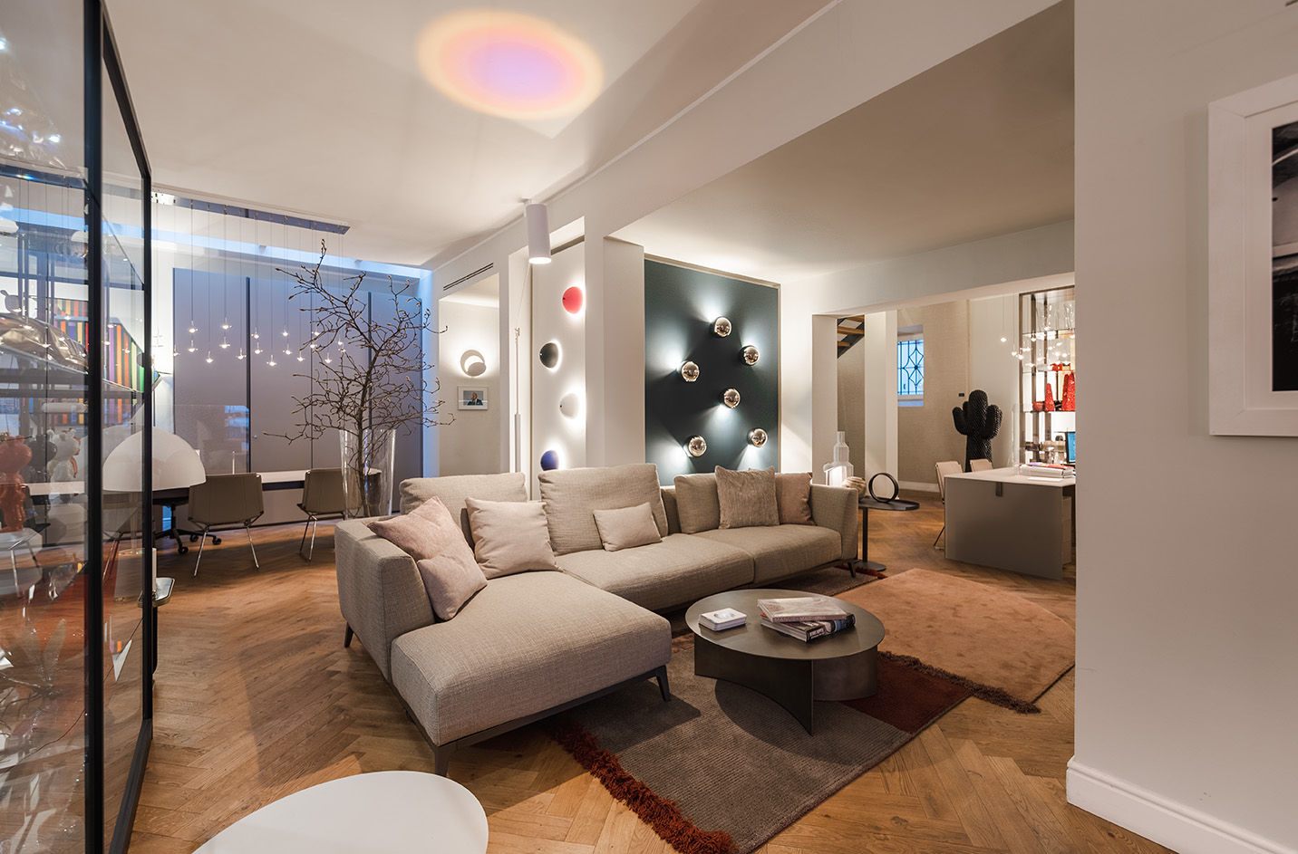 La proposta d’arredi Flou si sviluppa principalmente attorno ai due grandi spazi notte collocati nella vetrina dello showroom Salvioni Milano Durini e dominati dai letti Gaudí e Amal, a loro volta divisi dal divano componibile MyPlace. Il trittico accoglie il visitatore invitandolo a inoltrarsi nella calda atmosfera disegnata da Emanuela Garbin e rischiarata dagli arredi luminosi del brand Natevo di Flou cui si aggiunge l’imponente lampadario di Catellani&Smith.