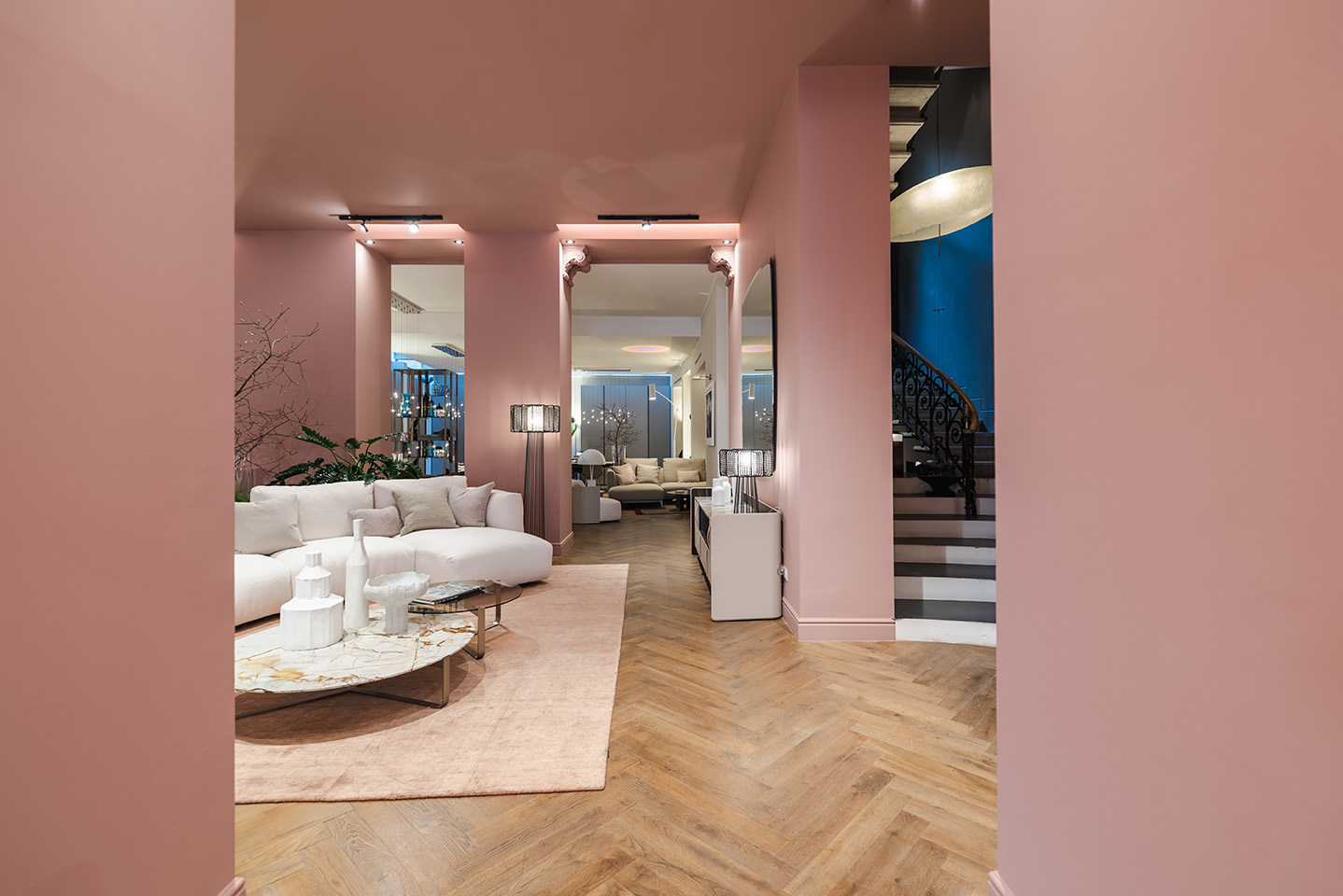 Lo scenario qui allestito verte principalmente sull’anima più “Decor” del marchio, adottando colori caldi come il pink fishing e il bricktown per le pareti e il soffitto, morbide tonalità cipria, metalli bronzati, legni naturali per i prodotti. L’accostamento di palette crea un contrasto assai gradevole, capace di stuzzicare la fantasia e catalizzare l’attenzione su più livelli.