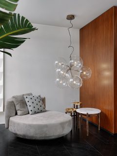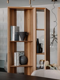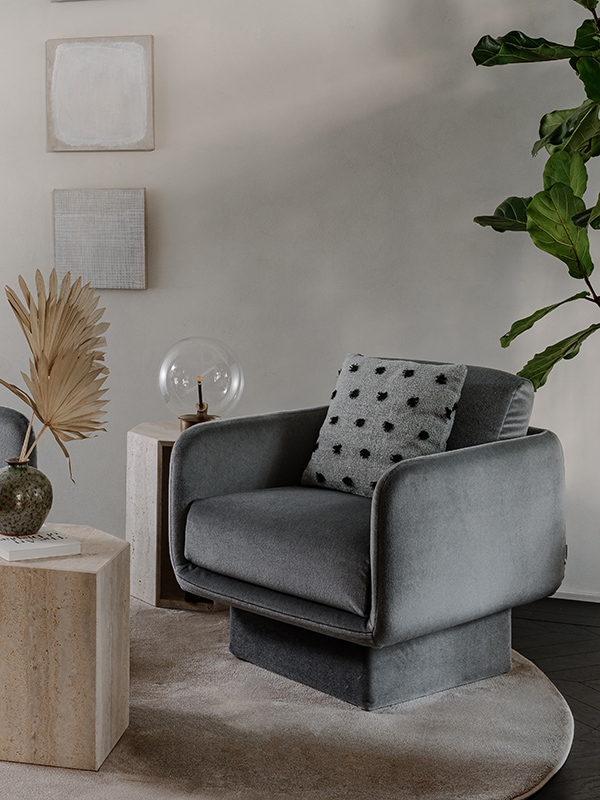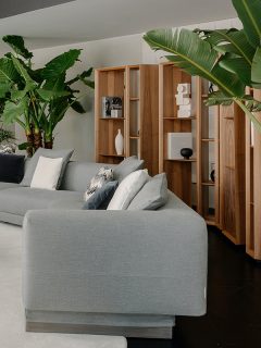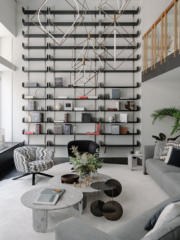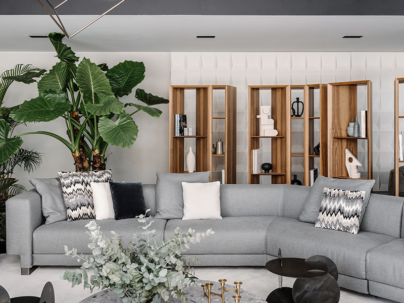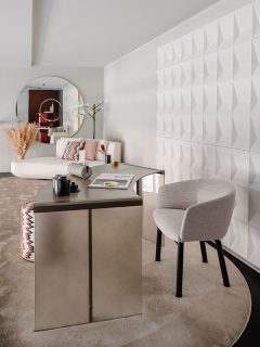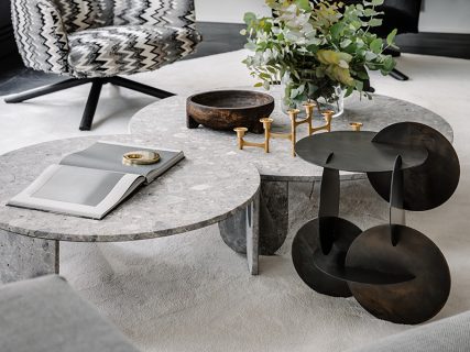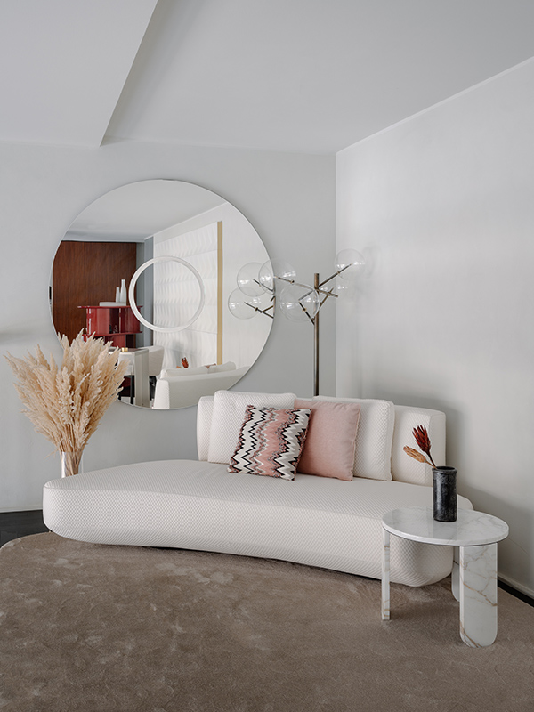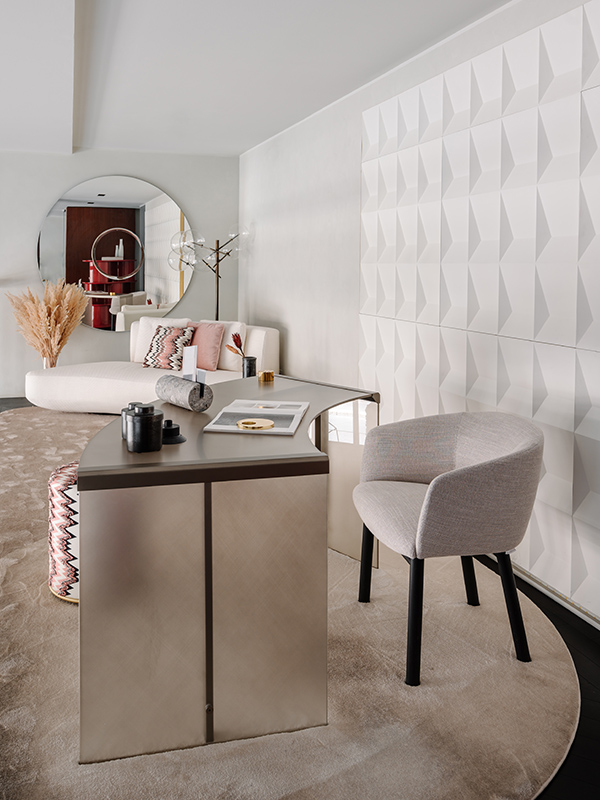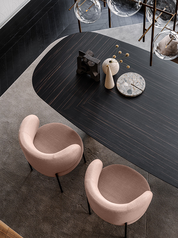 L’area living ospita le numerose proposte di Dainelli Studio, con la nuova poltroncina Lilas, il tappeto Resia e il divano modulare Elissa Sectional. Massimo Castagna introduce un tocco di personalità con i suoi tavolini Clemo e Monete, elementi materici e fortemente ispirati così come il divano Audrey nella versione XS.