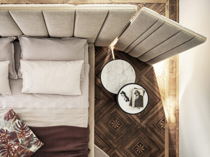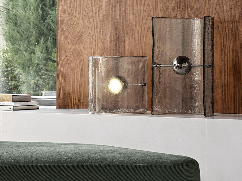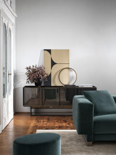 Ricche e seducenti, troviamo ancora le finiture caposaldo dell’azienda celebre per il sapiente utilizzo di vetro, ottone, legno, marmo e in un’infinita gamma di tessuti distintivi. Non mancano però alcune novità, come il tessuto Edena ispirato alla nobile arte degli arazzi o l’esclusiva finitura Cashmere ottenuta da una speciale lavorazione del cristallo. Altra prestigiosa new entry è il travertino, roccia sedimentaria simbolo della nobile architettura romana qui rivisitata da Gallotti&Radice in una chiave più moderna. Anche il legno riserva sorprese, grazie a tecniche artigianali ispirate alla tradizione ebanista come l’intarsio per suggestioni materiche ed estremamente naturali.