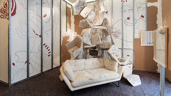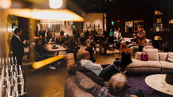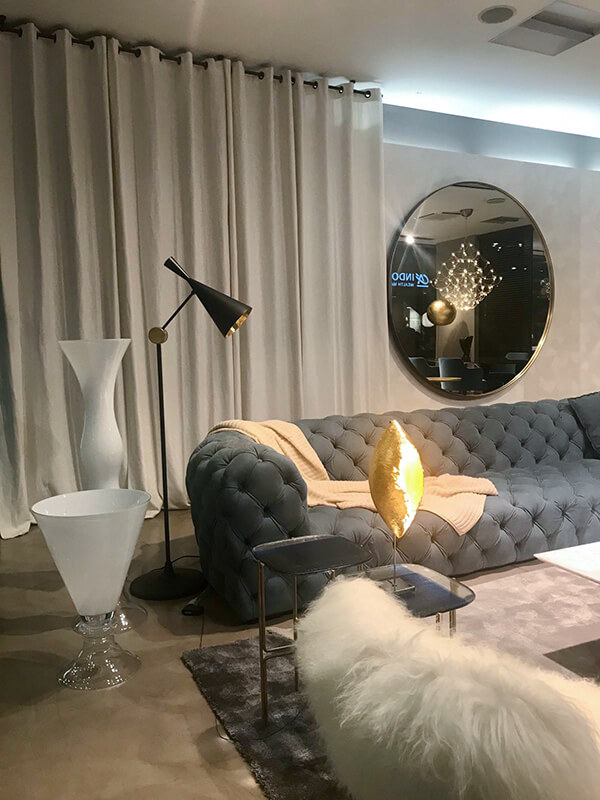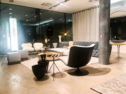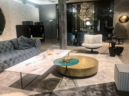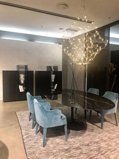 Nello spazio allestitivo trova posto un elegante soggiorno dalle tinte pastello, arredato con la caratteristica classe del marchio unita all’attenzione dei particolari che da sempre determinano lo stile di Salvioni in tutto il mondo.