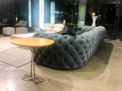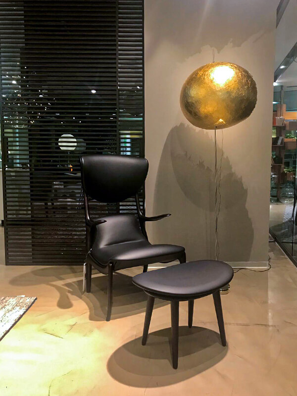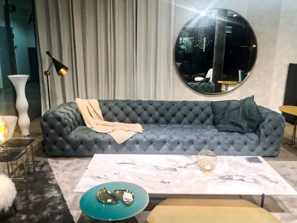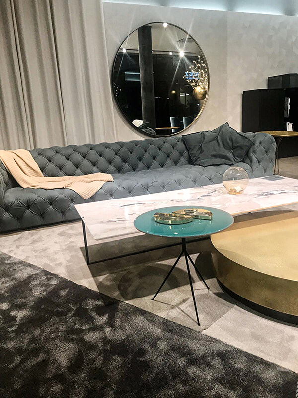 Fra le proposte, svetta l’iconico divano Chester Moon in pelle kashmir la cui lavorazione capitonné si accosta perfettamente alla poltrona Marilyn nella sfumatura Nuage. Sobrio ed elegante, il trio di tavolini Icaro, Liquid e Loren si inserisce in questa cornice retrò arricchendone la forza compositiva a sua volta esaltata dai pouf Anais e dalla poltroncina Nepal.