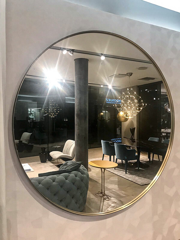Completano il quadro i tavolini Tetris con piano in vetrofusione blu e lo specchio Marlene, ampio ed essenziale nel cui riflesso si staglia il suggestivo lampadario Q2.