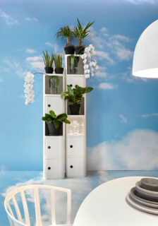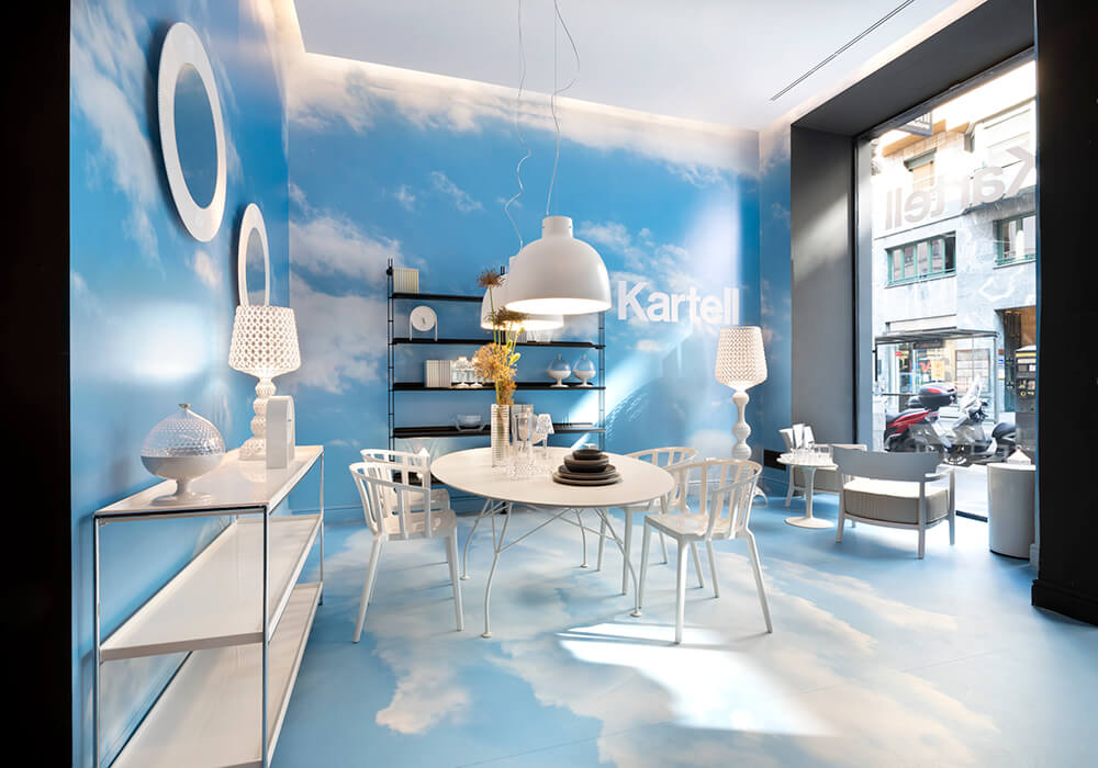 Un cielo azzurro increspato di nuvole che avvolge completamente, il pavimento, i muri e i display fa da sfondo a un allestimento originale ed esclusivo che strizza l’occhio all’estate e alla voglia di stare all’aria aperta. Un nuovo concept dalle linee eteree ma pop che crea un ambiente “en plein air” dove vengono presentati i prodotti appositamente pensati o declinati per vivere al meglio questa stagione. Il mood dell’allestimento rispecchia la filosofia del catalogo 2021 che Kartell ha scelto di utilizzare per presentare i prodotti con una nuova proposta espositiva che lascia spazio a diversi layout che sottolineano le diverse famiglie di prodotti con le loro infinite declinazioni, mescolando i masterpiece del brand con le ultime novità, e favorendo alcuni set allestitivi che ben sintetizzano lo spirito dell’ampliamento di gamma del catalogo Kartell.