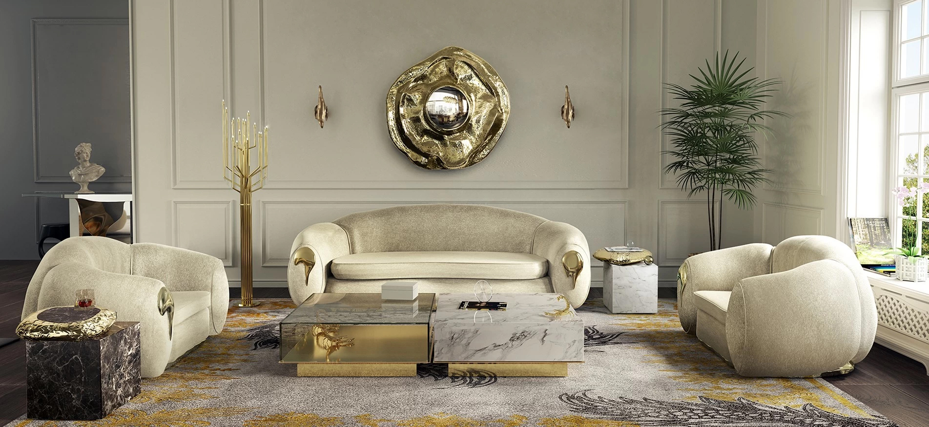 Le proposte del marchio si dividono in numerose categorie, offrendo per ogni ambiente una soluzione personale e curata nei minimi dettagli. Fra i prodotti più noti citiamo la credenza Pixel, la console Newton e la poltrona Angra I White, esempi di gusto e raffinatezza dove l’oro si fonde ad altri materiali nobili creando espressioni di estremo lusso e ricercatezza. Egualmente importanti sono il tavolino Ophelia Portoro e la madia Symphony, nonché la credenza Heritage sulla cui facciata trova posto un mosaico raffigurante motivi dell’antica Grecia. Splendidi sono lo specchio Filigree e il tavolo Fortuna, un vero e proprio trionfo di incisioni. Futuristica e ispirazionale è la lampada a sospensione Supernova, così come la Newton. Il divano Versailles II ripropone l’opulenza della Francia del Re Sole con i suoi motivi scolpiti.