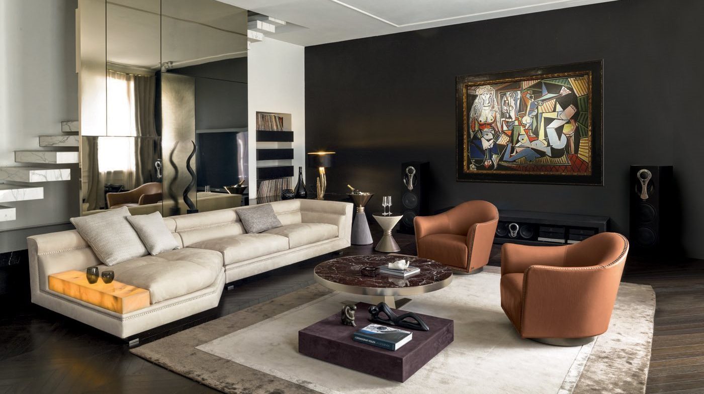 Il lusso degli arredi Longhi nasce in primo luogo dall’uso di materiali di finissima qualità: divani e poltrone realizzati a mano, rivestiti con pelli trattate unicamente con procedimenti naturali o velluti di pregio; tavoli e tavolini con piani in marmo o onice e madie realizzate in legni dalle essenze rare di prima categoria. Ogni pezzo va a costituire un catalogo di proposte ricche e sfarzose, pensate per una clientela in cerca di eccellenza.