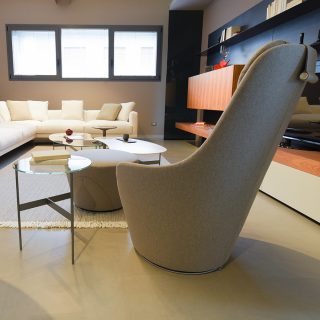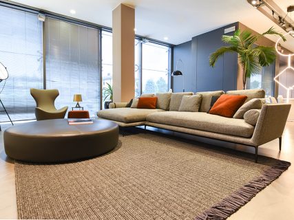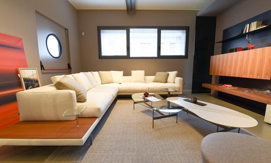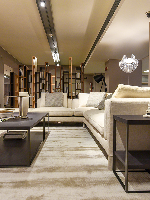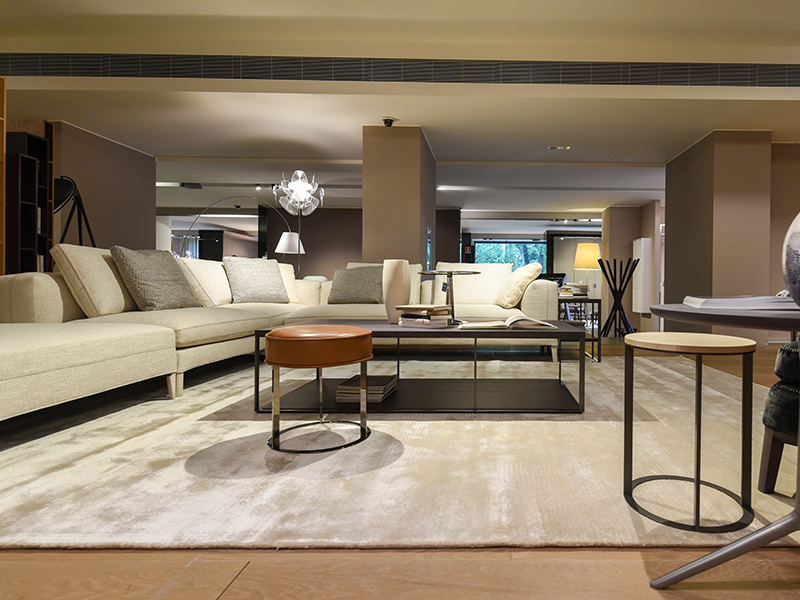 Per quanto attiene B&B Italia, ospiti d’onore sono gli imbottiti, fra cui spiccano i divani Atoll e Dock presentati sia nella versione angolare che a penisola. Questi elementi sono stati accostati alle poltrone Frank e Harbor, ai tavolini Pianura, Mirto, Formiche e Spool e ai pouf Frank. La riuscita complementarietà di tessile, legno, vetro e pelle offrono all’occhio una visione totalizzante ed eterogenea che con gusto impeccabile intreccia colori, materie e superfici. Completano il tutto i due tappeti Timo la cui forte presenza materica esalta perfettamente la grande varietà stilistica.