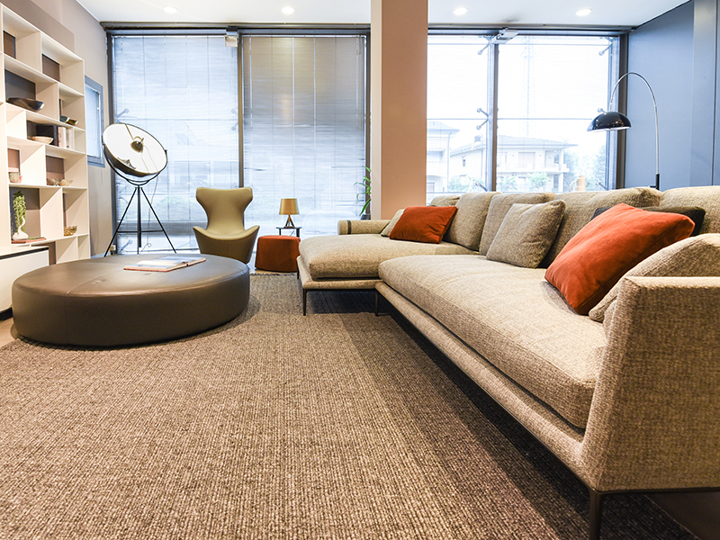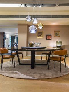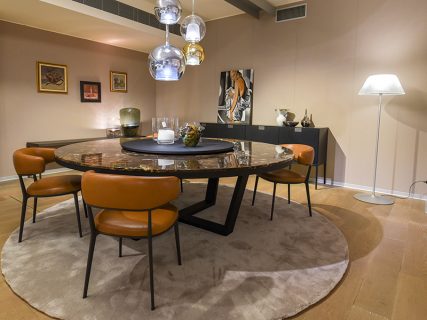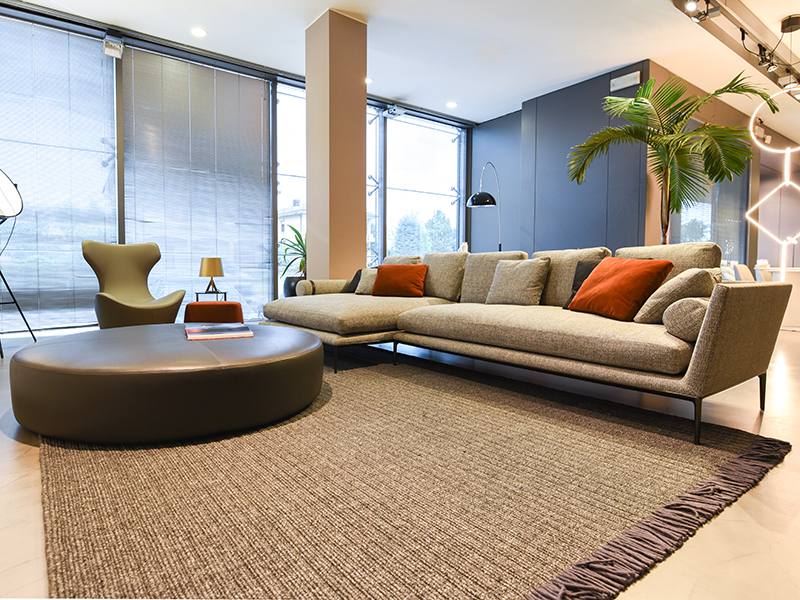 Anche qui, la scelta di tappeti fortemente denotati come Caldes e Alcor, favoriscono l’arricchimento della scena, donandole così uno sfondo perfetto dove i differenti pezzi d’arredo si inseriscono in una commistione di percezioni ed emozioni.