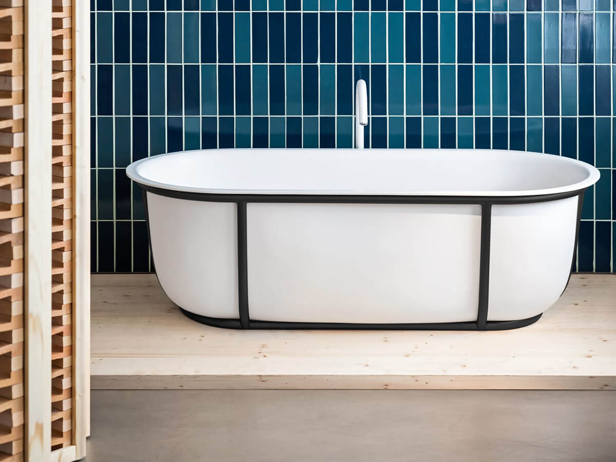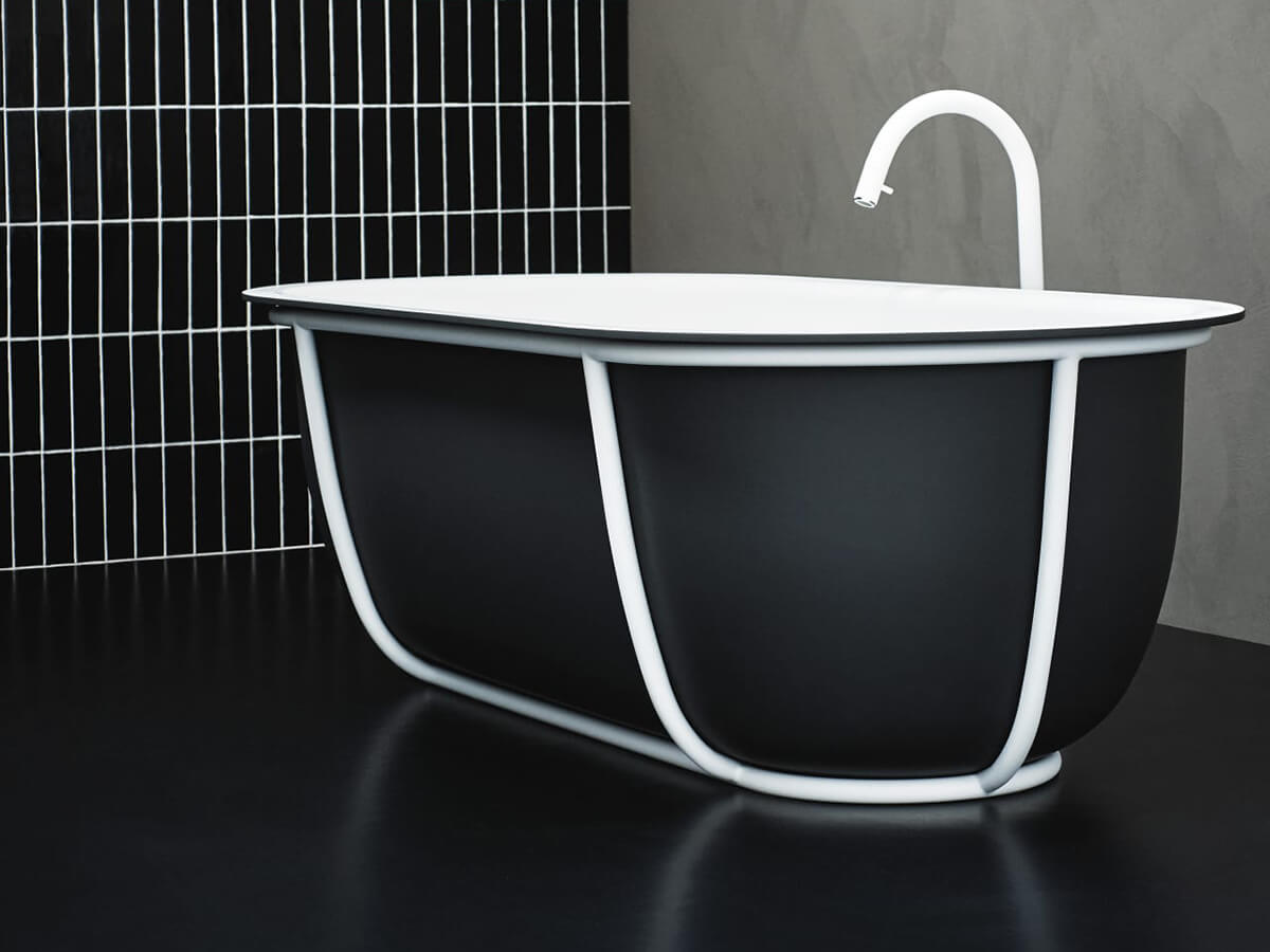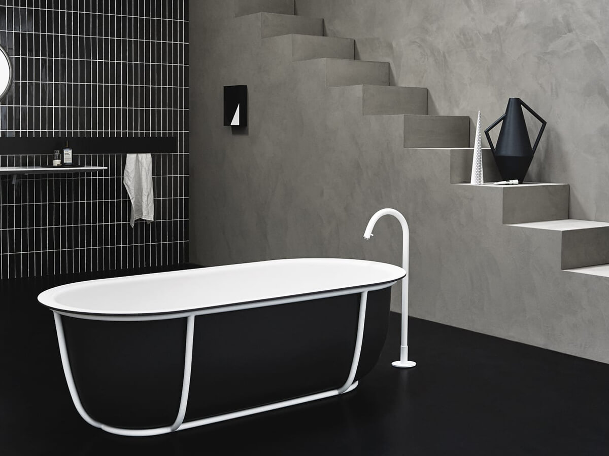 La vasca Cuna di Agape porta la firma della design-star spagnola Patricia Urquiola e si caratterizza per una sapiente fusione di materiali. In Cuna una classica vasca in Solid Surface bianco (verniciabile esternamente anche con i colori grigio chiaro o grigio scuro), dalla forma di un’ovale delicatamente tondeggiante, è racchiusa da una struttura portante in tubolare d’acciaio. Il tubolare va così a imbrigliare e sostenere la vasca, disegnando sulla sua superficie un gioco di linee di grande fascino e raffinatezza. L’effetto finale, sempre elegantissimo, può variare molto a seconda del colore scelto per la verniciatura del tubolare (bianco, grigio chiaro, nero o brunito spazzolato). Le dimensioni molto compatte di Cuna la rendono perfetta anche per l’inserimento in ambienti bagno di piccole dimensioni.Caratteristiche tecniche: piletta sifonata cromata inclusa con sistema per troppo pieno integrato
