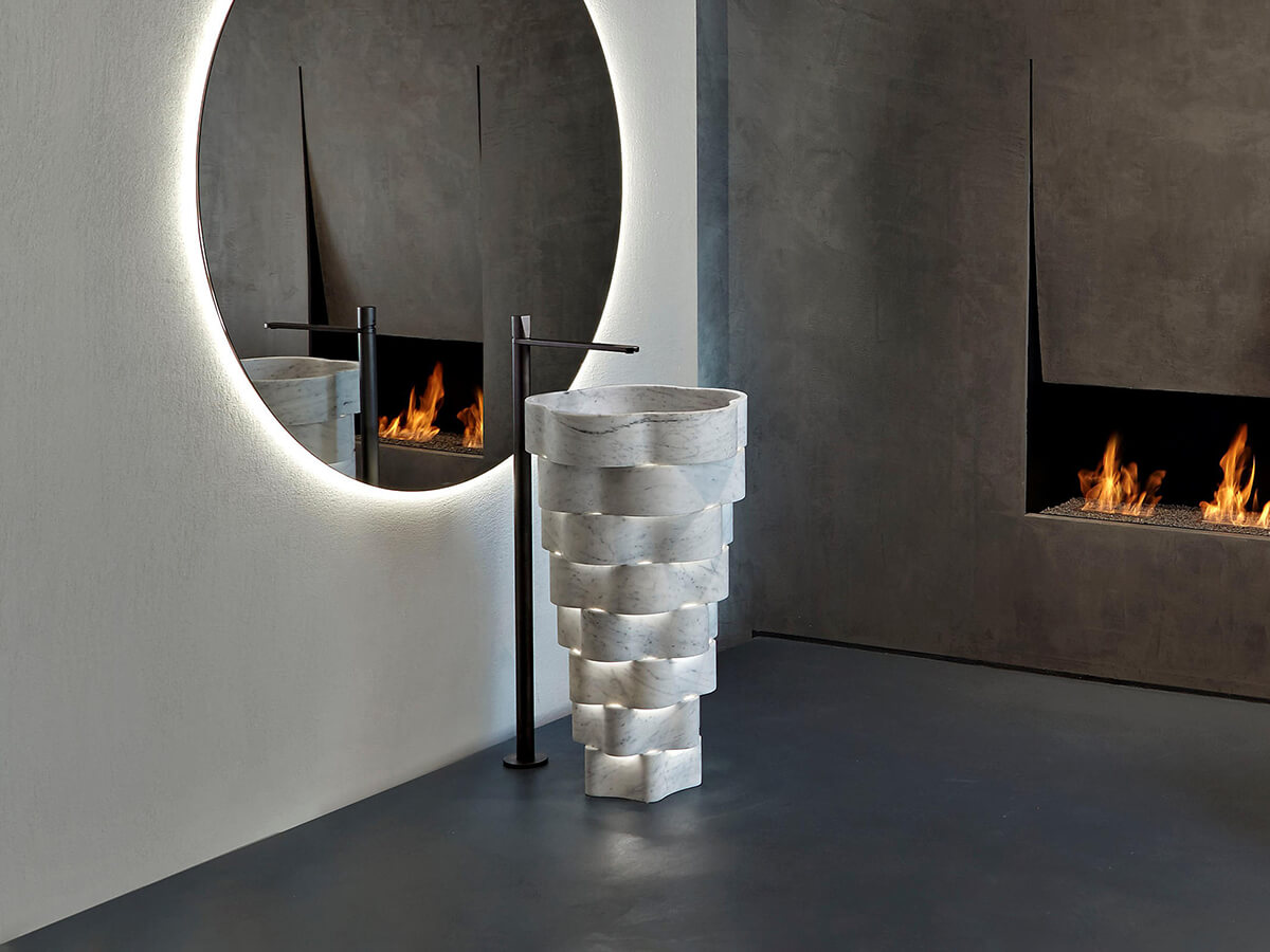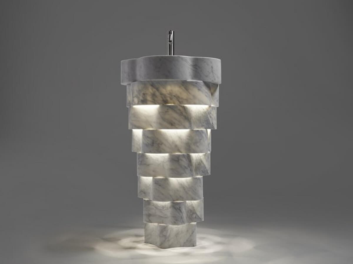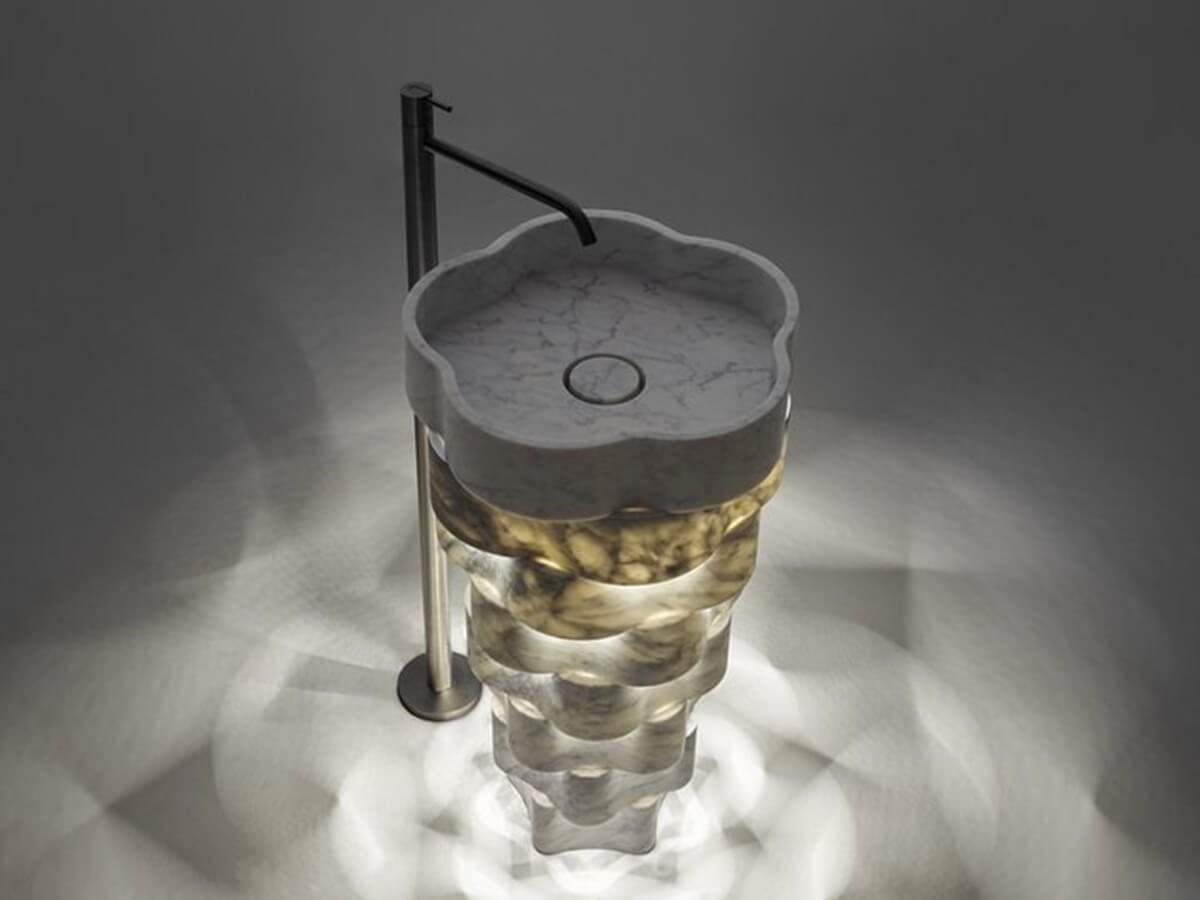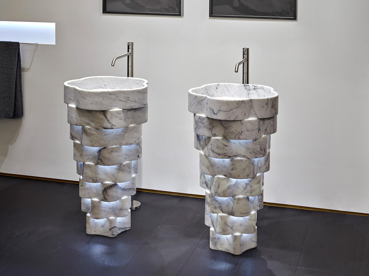 Il lavabo da terra Intreccio è un altro dei sorprendenti frutti della collaborazione tra Antoniolupi e l’artista Paolo Ulian. Con le sue forme naturali ed aggraziate tra da un materiale monolitico come il marmo effetti di inaspettata levità, enfatizzati dai fascinosi effetti di chiaroscuro generati sulla pietra dalla luce. Intreccio, dotato opzionalmente anche di illuminazione led, si caratterizza anche per un metodo di produzione attento ad evitare ogni spreco di materiale: è infatti composto da una serie di anelli concentrici ricavati uno dentro l’altro dallo stesso blocco di marmo, ritagliati poi in spessori sottilissimi e in bordi curvilinei per ottenere un manufatto di estrema leggerezza (Intreccio pesa poco più di 50 kg), che parte da una base ristretta e si allarga progressivamente fino a culminare in un ampio bacino lavamani.