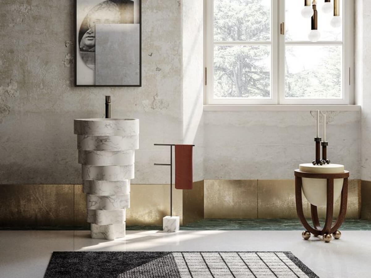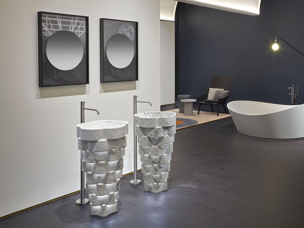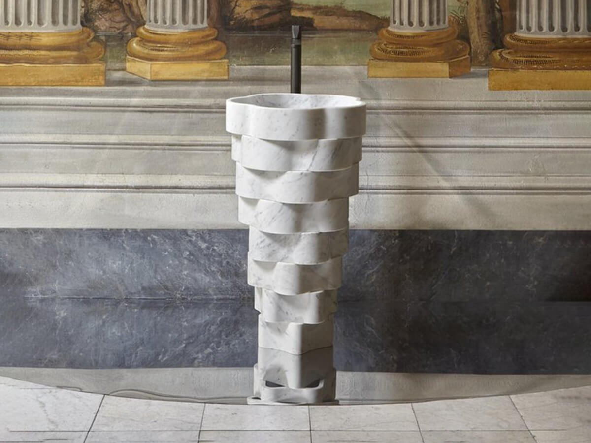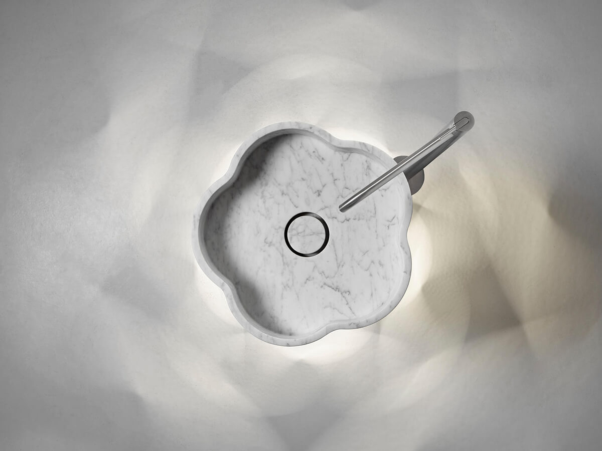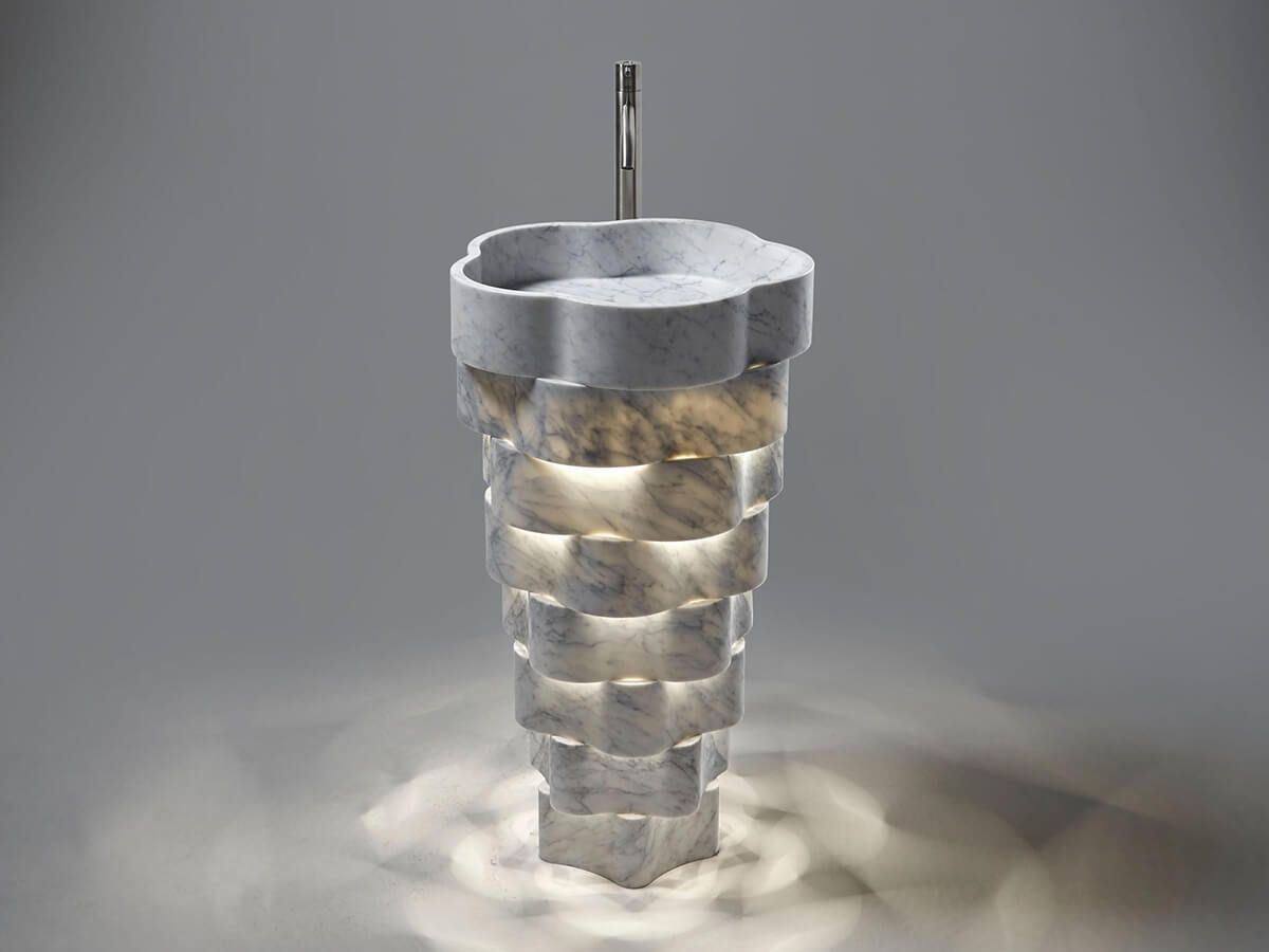 Il lavabo da terra Intreccio è un altro dei sorprendenti frutti della collaborazione tra Antoniolupi e l’artista Paolo Ulian. Con le sue forme naturali ed aggraziate tra da un materiale monolitico come il marmo effetti di inaspettata levità, enfatizzati dai fascinosi effetti di chiaroscuro generati sulla pietra dalla luce. Intreccio, dotato opzionalmente anche di illuminazione led, si caratterizza anche per un metodo di produzione attento ad evitare ogni spreco di materiale: è infatti composto da una serie di anelli concentrici ricavati uno dentro l’altro dallo stesso blocco di marmo, ritagliati poi in spessori sottilissimi e in bordi curvilinei per ottenere un manufatto di estrema leggerezza (Intreccio pesa poco più di 50 kg), che parte da una base ristretta e si allarga progressivamente fino a culminare in un ampio bacino lavamani.
