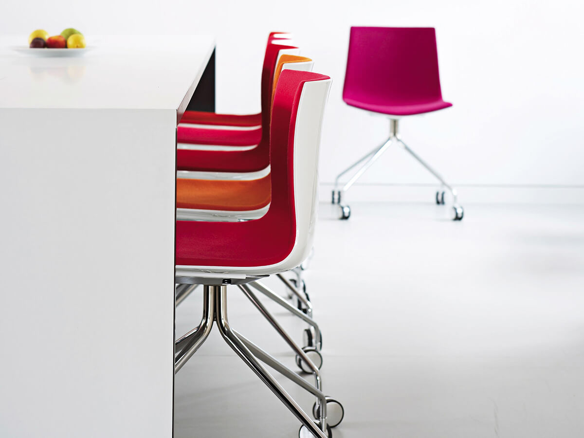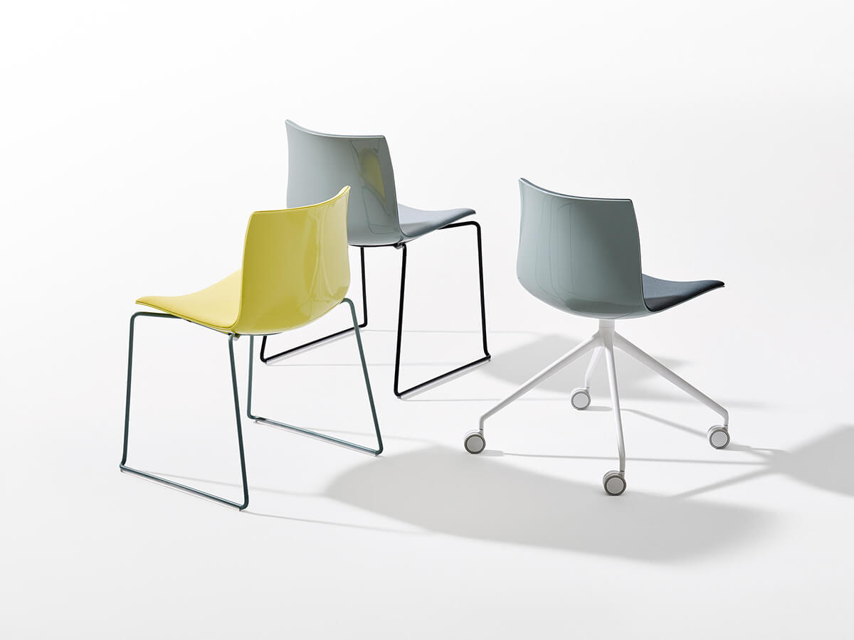 La collezione Catifa esprime un lungo viaggio nel mondo del design essenziale, dominato da pochi tratti e linee decise, capaci di riassumere un’estetica senza tempo che ben si adatta al gusto e al sentire del nostro tempo. Catifa 46 è nota per le versioni a slitta, trespolo su piedini, trespolo su ruote, a 5 razze e con gambe in legno. Oltre alle sedie è però doveroso citare gli sgabelli, anch’essi disponibili in numerose versioni con slitte e trespoli a seconda delle esigenze. In qualunque veste, si presta bene per soluzioni contract a anche per spazi più compatti, domestici ed estremamente personali. La gamma di colori, finiture, fusti e accessori disponibili aumentano incredibilmente le possibilità offerte da questa seduta senza tempo.
