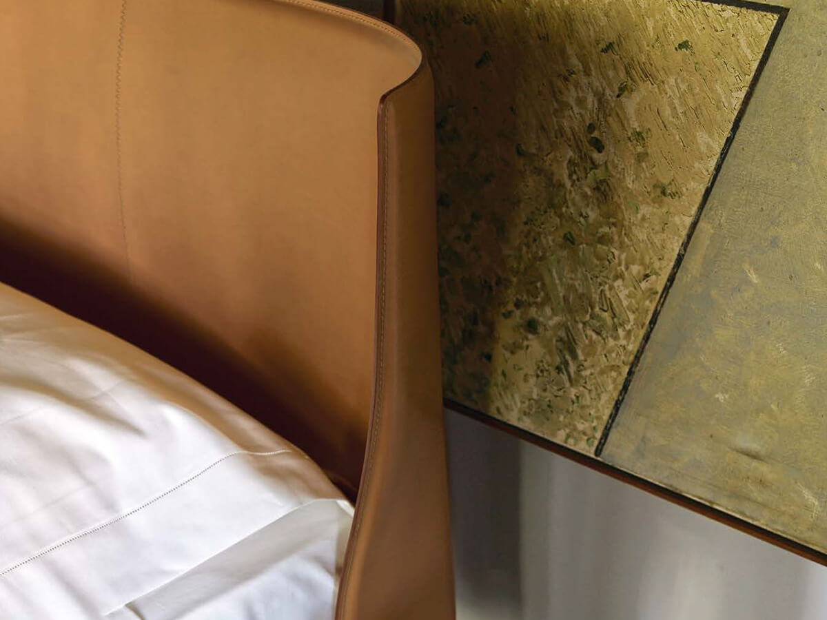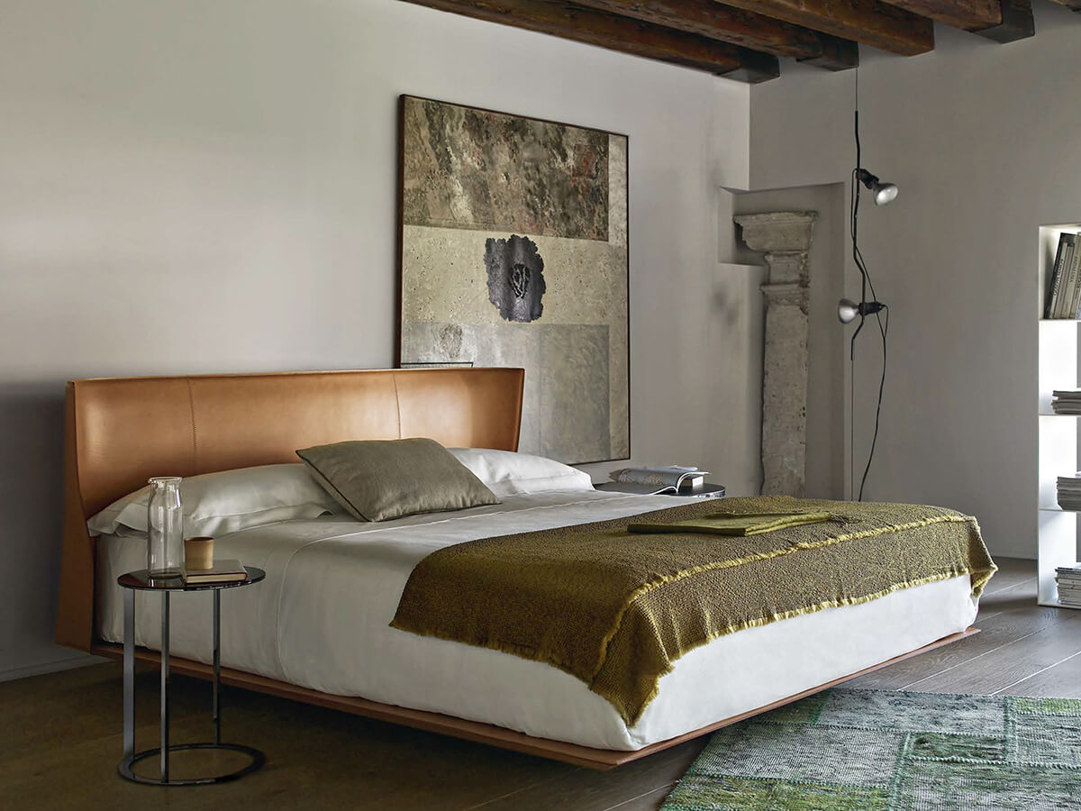 Un letto di grande eleganza, capace di coniugare un materiale forte come il cuoio a linee gentili e ben modulate volute da Gabriele e Oscar Buratti. Il punto focale di Alys risiede proprio nella testata in cuoio i cui bordi “pizzicati” ricordano un grande foglio disteso oltre la mole generosa di questo elemento d’arredo. Dallo studio della sedia Doyl i designer traggono l’esperienza per questo prodotto dedicati alla zona notte, accogliente e confortevole, arricchito dalla cura artigianale che da sempre distingue l’operato di B&B Italia. La testata si accompagna a fasce perimetrali particolarmente ridotte nello spessore, segnate da una cucitura di grande effetto. Il piano del letto può essere sospeso da terra a differenti altezze, sebbene rimanga volutamente basso per suggerire un effetto di sospensione e galleggiamento.