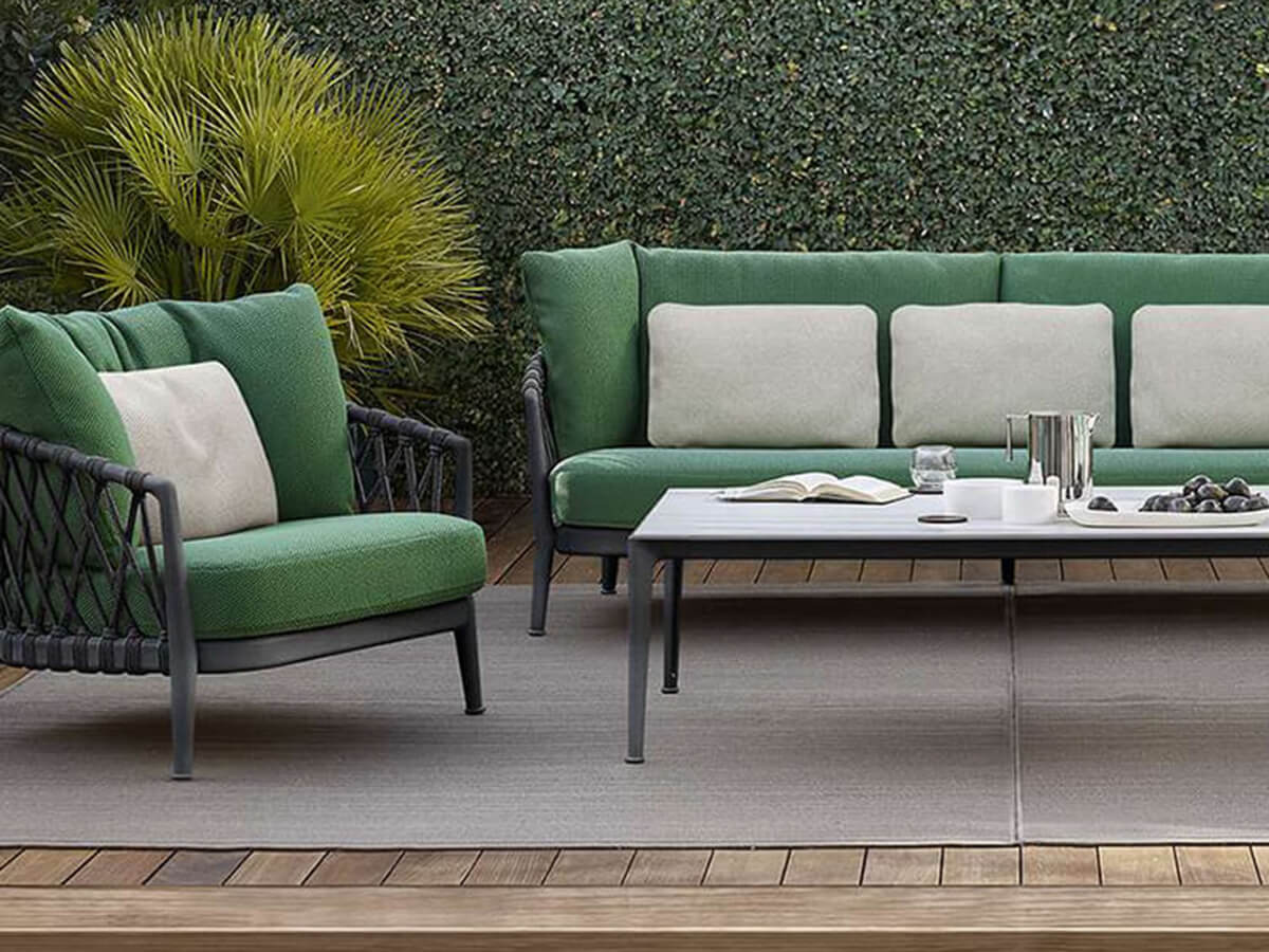 La collezione Erica approda nel mondo dell’outdoor, dando sfoggio di una gamma completa di divani, poltrone, poltroncine e sedie, studiati con un mix di tecnologia e design d’alta gamma. L’impressione che ne deriva è di trovarsi di fronte a elementi d’arredo nuovi e rétro al contempo, capaci di impressionare per leggerezza estetica e disegno d’avanguardia che ben li colloca tanto negli spazi più intimi della casa quanto in zone più ampie e pubbliche. Gli intrecci di nastri in tessuto sintetico dello schienale si fondono a un’anima interna ad alta tenacità studiata per l’utilizzo outdoor; la struttura in alluminio verniciato con intreccio in fibra di polipropilene dà vita a sedute comode ed estremamente ergonomiche, adatta a ospitare il corpo.