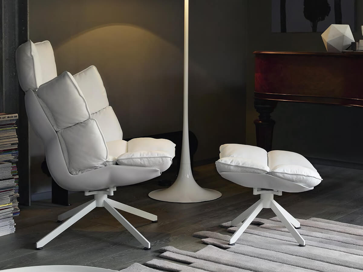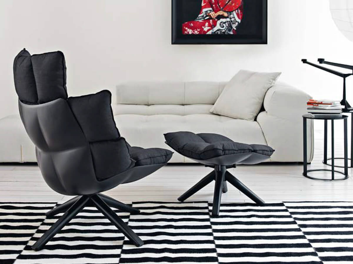 La poltrona Husk rappresenta una delle molte icone di B&B Italia, elemento d’arredo comunemente riconosciuto per la sua bellezza non convenzionale capace di ispirare il design del suo tempo. Patricia Urquiola la disegna con un occhio di riguardo all’ergonomicità cui rimedia creando una scocca rigida in Hirek ® che contiene una cuscinatura soffice suddivisa in porzioni imbottite. La sua originalità estetica viene ulteriormente accentuata dalla scelta di basamenti fissi o girevoli personalizzabili in diverse colorazioni e tonalità. Anche il rivestimento in tessuto è personalizzabile, così da massimizzare il carattere distintivo che rende Husk unica nel suo genere. Disponibile anche nella versione outdoor, i prodotti Husk comprendono poltroncine, tavolini, letti e divani.