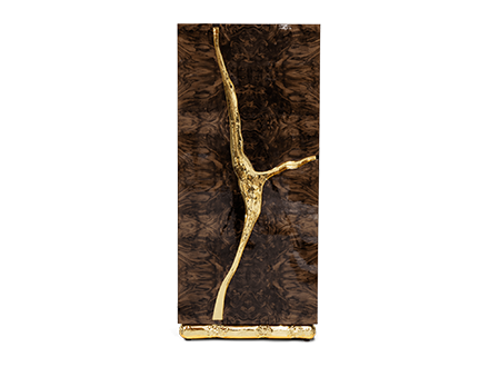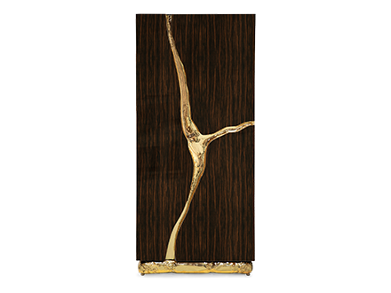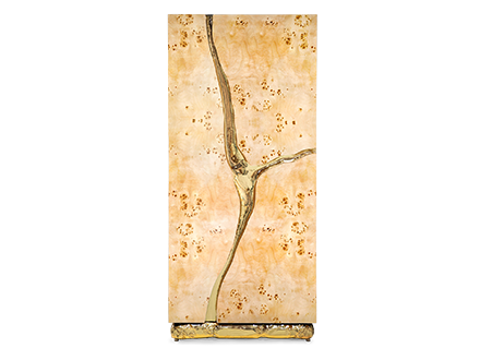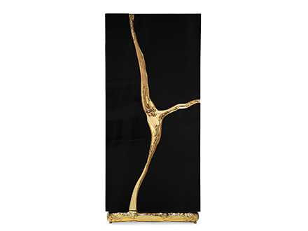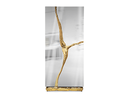 La madia Lapiaz presenta un design eccezionalmente elegante e sofisticato, che mischia una ricerca estetica di alto livello a un’artigianalità che guarda alla ricchezza dei particolari. Lapiaz trae ispirazione dalle antiche formazioni carsiche, ottenuta inserendo manualmente dell’ottone lucido e una finitura a specchio in acciaio inox da cui se ne ricava una superficie perfetta. Ante e cassetti sono in forma diversa e si aprono su vani differenziati in legno impiallacciato in radica di pioppo. I dettagli in oro martellato e la facciata riflettente si intonano perfettamente a spazi sofisticati e di estrema eleganza dove si voglia aggiungere un tocco di astrazione e bellezza. Ideale in ambienti living, può comunque trovare spazio in situazioni pubbliche di hotel e reception.