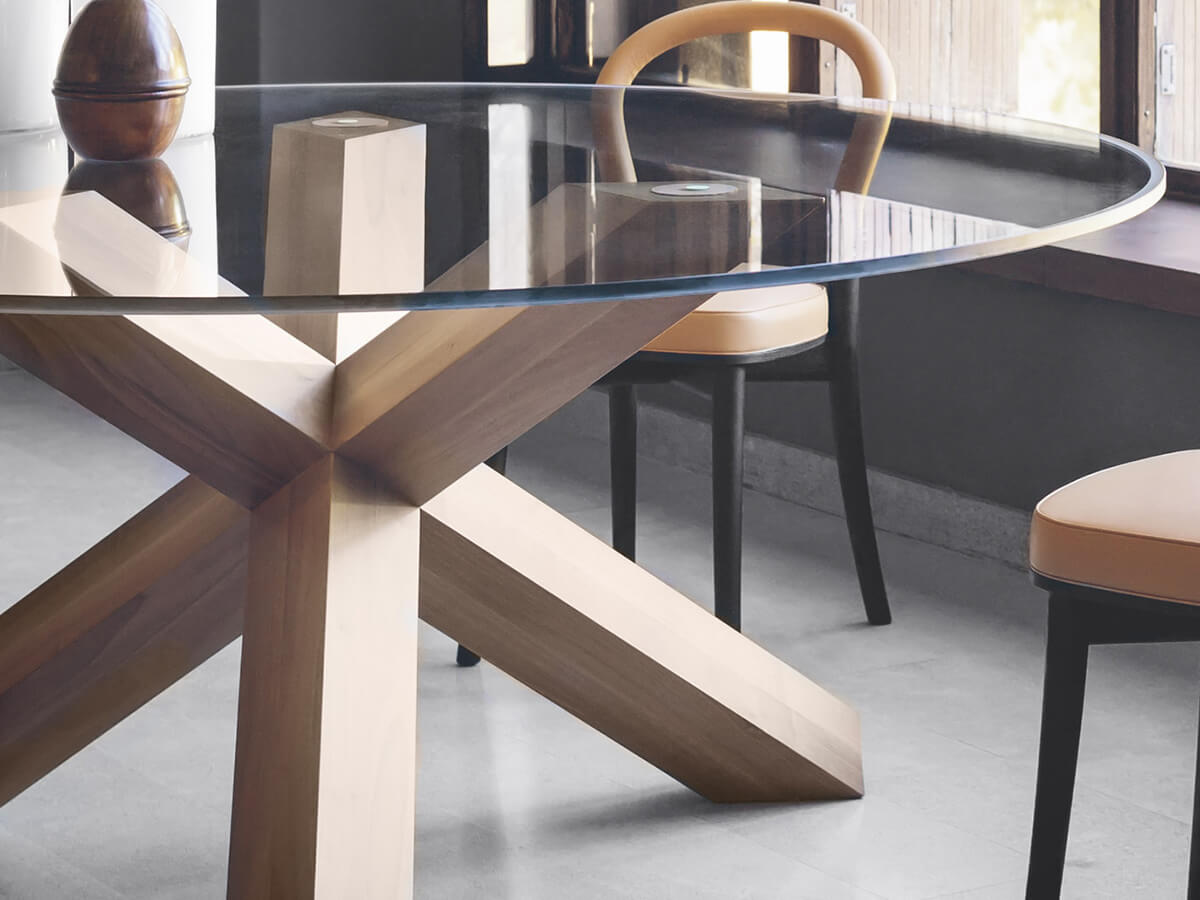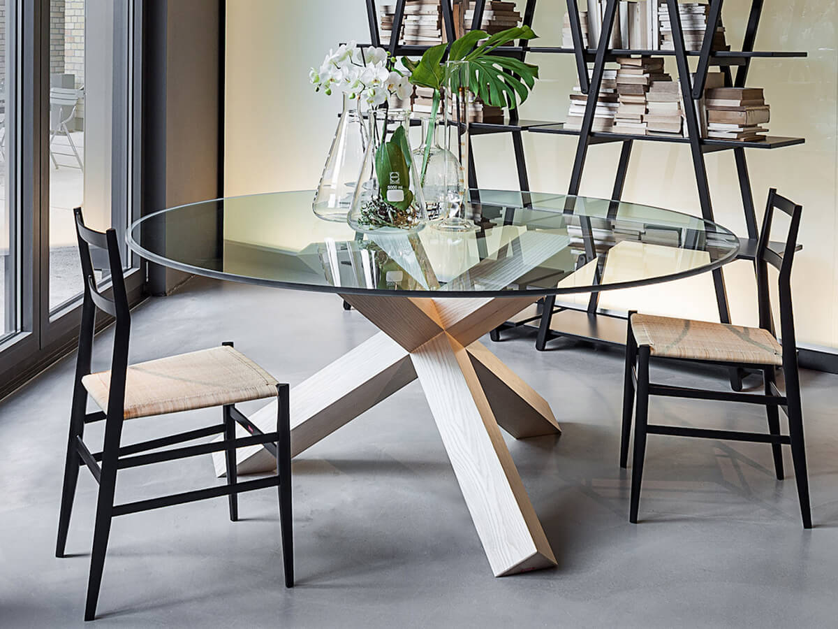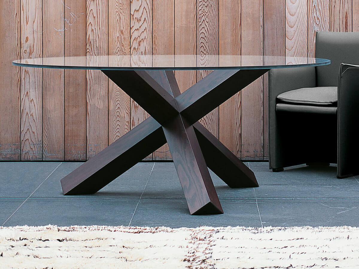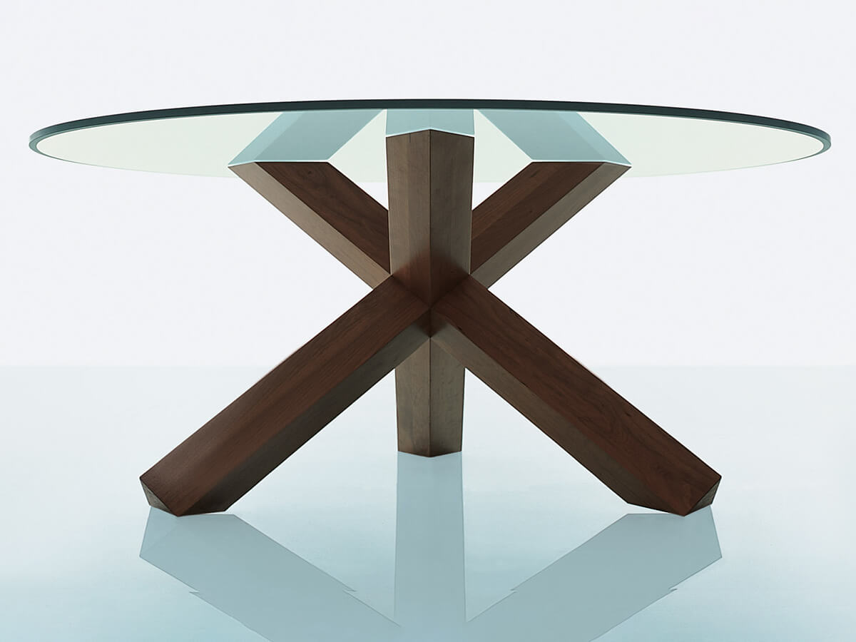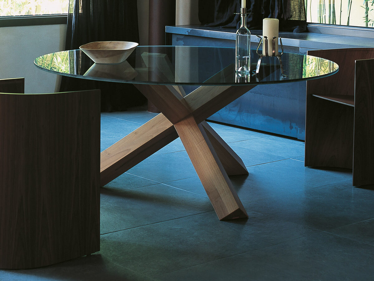 Un tavolo la cui bellezza primeggia non soltanto per originalità, ma soprattutto per raffinatezza estetica. La Rotonda è un oggetto capace di trasformare il calore del legno in bellezza, associando a una base estremamente semplice un piano leggerissimo e sottile in vetro. Le tre gambe a sezione quadrata si incrociano perpendicolarmente incastrandosi e compenetrandosi così da creare una forma scultorea che esula le mere geometrie per raggiungere una composizione quasi astratta. Solidi incastri ricavati direttamente dal massello grazie alla lavorazione di Cassina crea un buon connubio fra tecnica e forma. Disponibile in una gran varietà di legni, questo tavolo di Mario Bellini presenta anche versioni in marmo, ottime per raggiungere ambienti della casa più raffinati e ambivalenti.