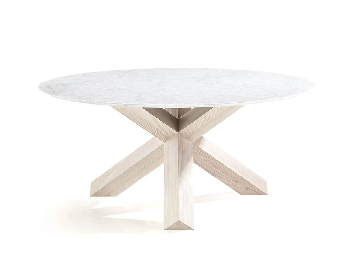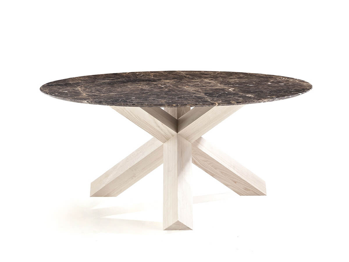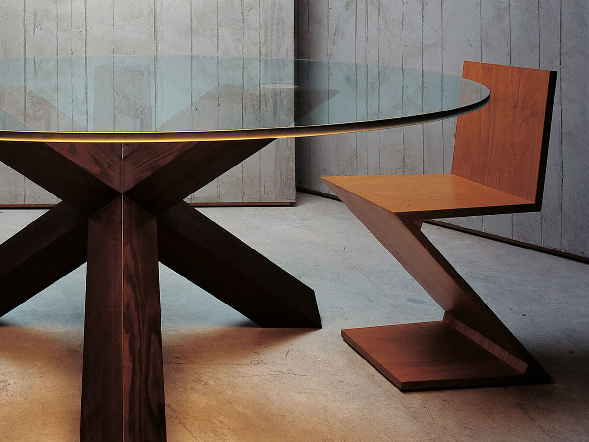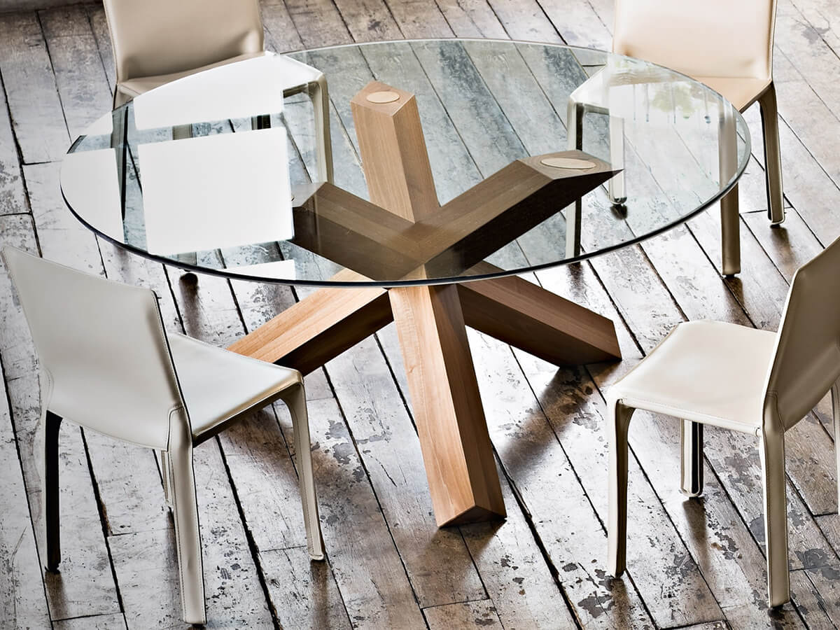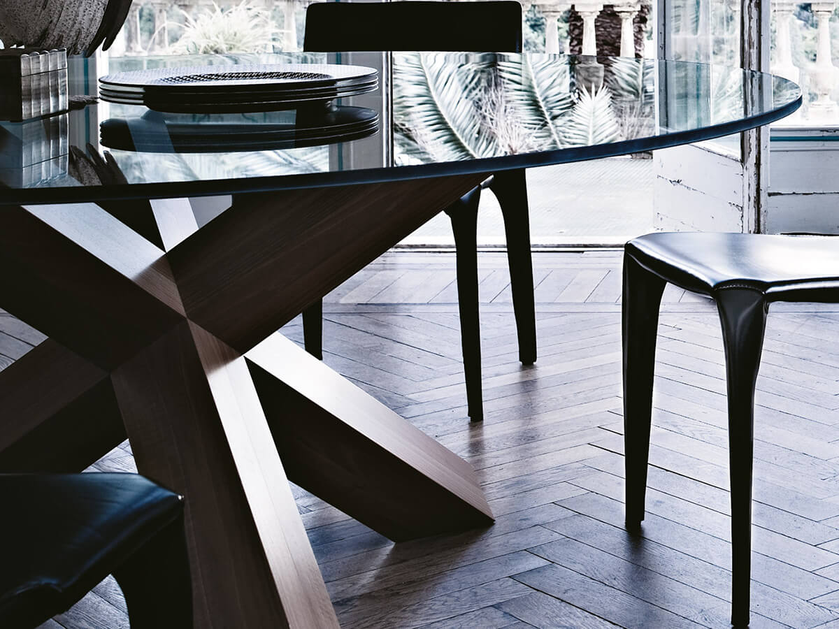 Un tavolo la cui bellezza primeggia non soltanto per originalità, ma soprattutto per raffinatezza estetica. La Rotonda è un oggetto capace di trasformare il calore del legno in bellezza, associando a una base estremamente semplice un piano leggerissimo e sottile in vetro. Le tre gambe a sezione quadrata si incrociano perpendicolarmente incastrandosi e compenetrandosi così da creare una forma scultorea che esula le mere geometrie per raggiungere una composizione quasi astratta. Solidi incastri ricavati direttamente dal massello grazie alla lavorazione di Cassina crea un buon connubio fra tecnica e forma. Disponibile in una gran varietà di legni, questo tavolo di Mario Bellini presenta anche versioni in marmo, ottime per raggiungere ambienti della casa più raffinati e ambivalenti.
