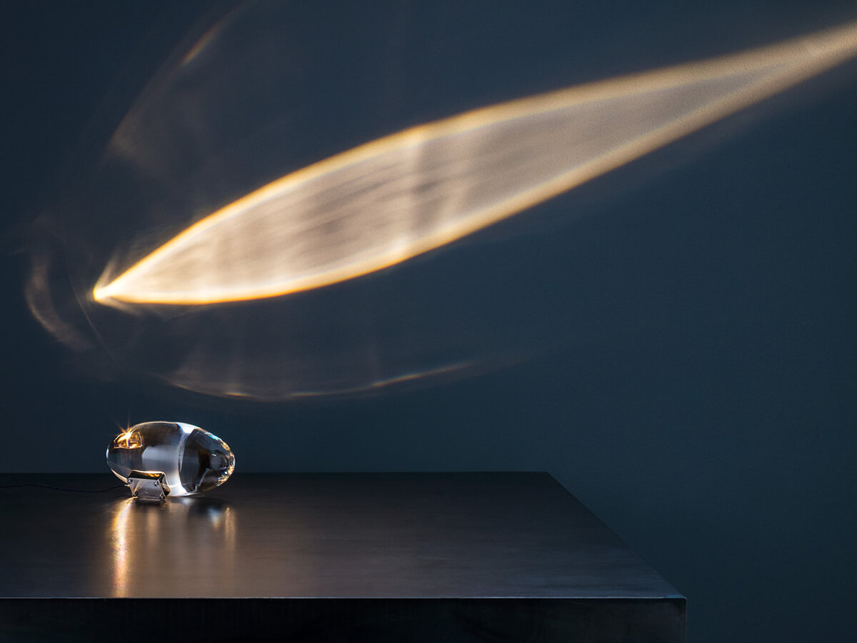 L’idea di questa lampada nasce in India quando Enzo Catellani entra a contatto con la spiritualità e la miseria del posto. Atman è una lampada da tavolo ovale che ricalca la forma delle pietre sacre. E’ fatta di cristallo con una base nichelata e il suo nome significa “anima”. Il led incorporato proietta sul muro la luce, creando ombre naturali, simili a quelle prodotte dalle foglie di un albero. La qualità della luce crea un’atmosfera zen, rilassante, che invita alla contemplazione. Tramite il dimmer, posizionato sul cavo di alimentazione, è possibile aumentare o abbassare la luminosità creando giochi di luce e ombra molto suggestivi.