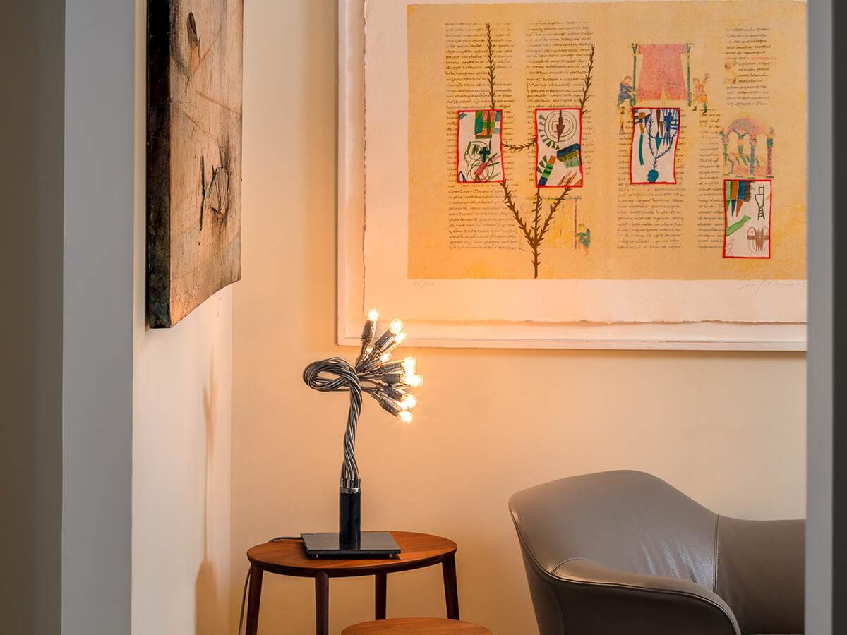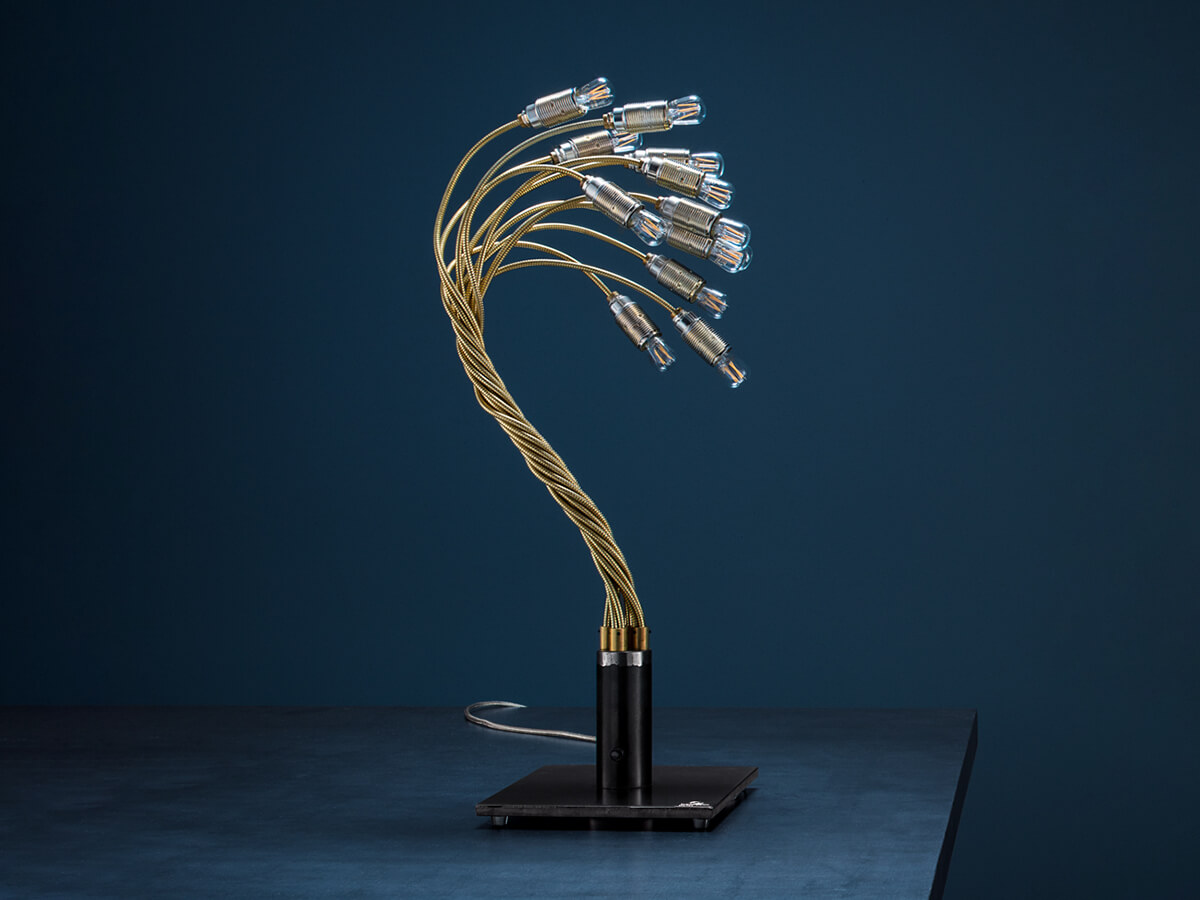 Questa lampada da tavolo appartiene alla serie Turciù che ha dato prestigio e risonanza alla produzione della Catellani & Smith fin dalla sua nascita nel 1989. Bonsai è formata da una struttura in ferro grezzo cerato e da dodici flex in ottone. Il designer Enzo Catellani ha pensato di associare una lampadina Led o alogena a delle braccia flessibili e modellabili a piacere, guidato da un rigore artigianale e da un occhio sempre rivolto alla cura del dettaglio. Il risultato è una lampada facilmente riconoscibile ed unica nel suo genere, perfetta se collocata su un tavolo basso accanto al divano ma anche su una mensola o sui comodini della zona notte.