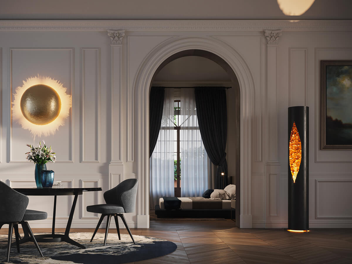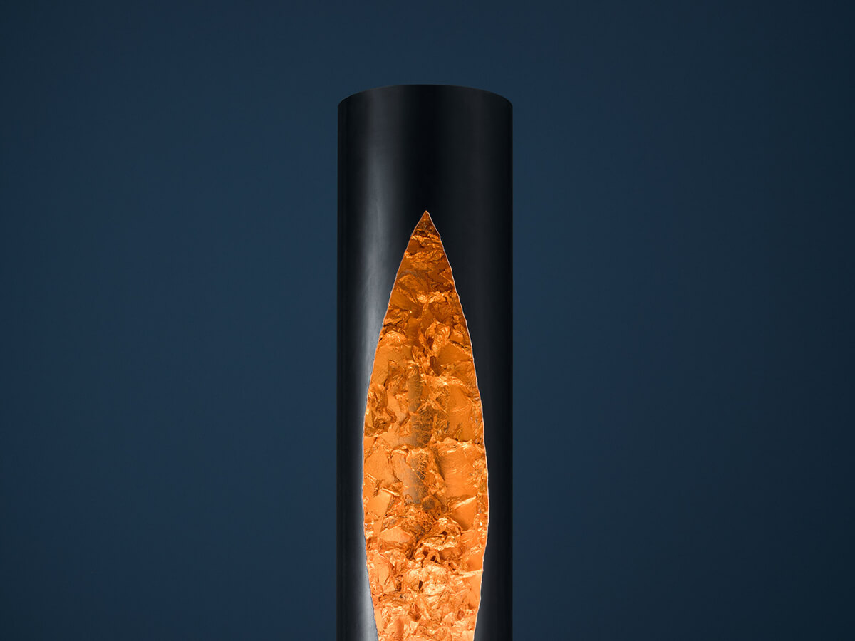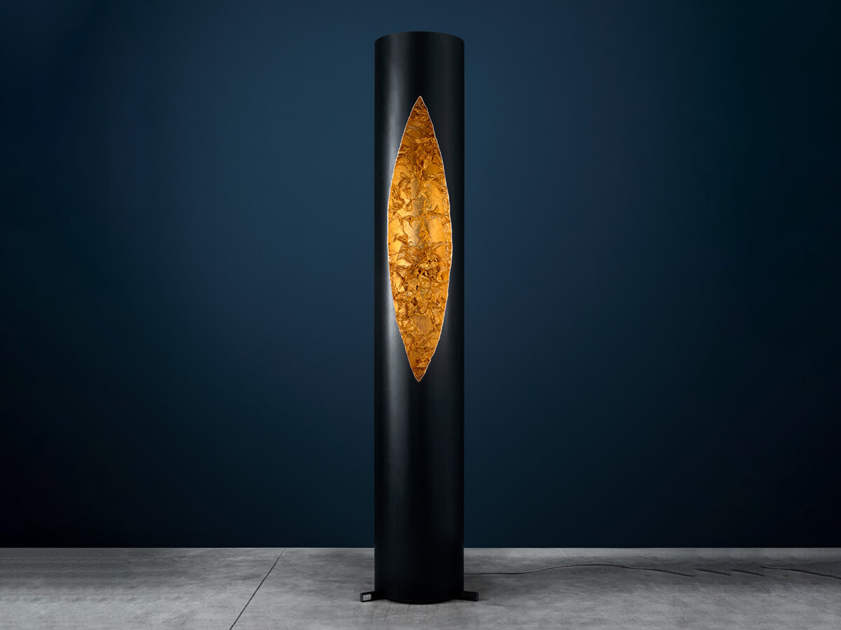 La riflessione sul colore della luce e sulle leggi fisiche della rifrazione sono il “fil rouge” conduttore della collezione “Luci d’Oro” alla quale appartiene la lampada da terra Colonna. Nata dall’intuizione di Enzo Catellani, questa lampada si compone di un tubo in ferro cerato il cui interno viene artigianalmente rivestito in foglia oro o nelle varianti in foglia rame o foglia argento ed illuminato tramite lampadina Led con dimmer da terra. Le dimensioni di questa lampada con diametro di 33 cm ed un’altezza di 200 cm la rendono versatile ed adatta a valorizzare i vari ambienti non solo domestici.