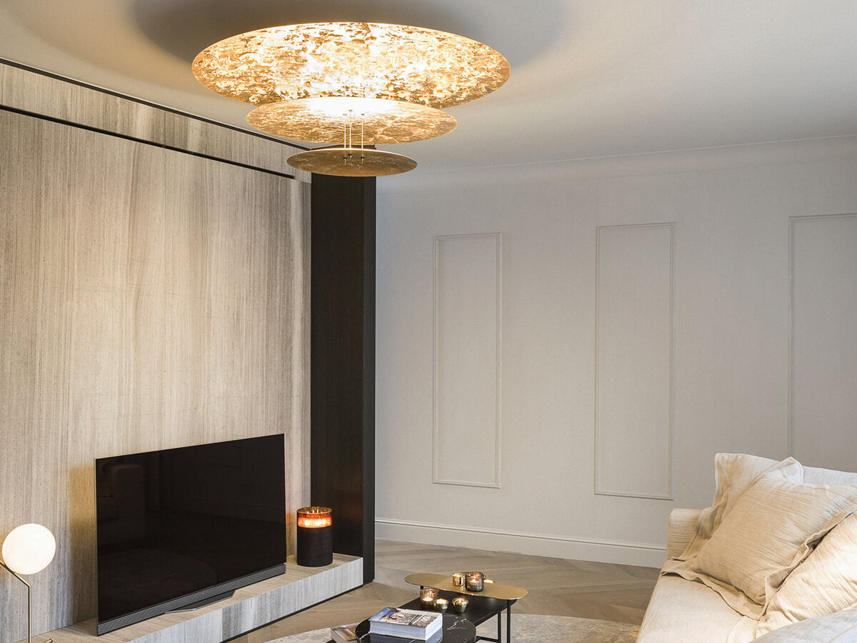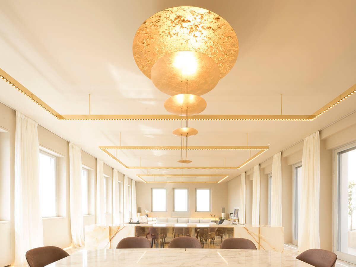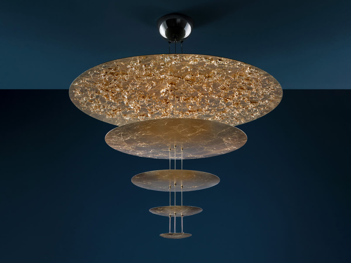 Preziosa e raffinata, questa lampada a sospensione che può raggiungere nelle sue varianti anche delle dimensioni spettacolari, arreda lo spazio in modo scenografico. Macchina della Luce prodotta da Catellani & Smith si compone di una base in nickel e di diversi dischi diffusori in alluminio interamente rivestiti in foglia, applicata a mano e disponibile nelle finiture oro, rame ed argento. Questo lavoro minuzioso dà vita ad una bella texture irregolare che gioca con i riflessi e la luce. Le sorgenti LED sono poste al di sopra dei dischi. La luce emessa è orientata verso l'alto poi riflessa sul disco superiore. I dischi sono montati su tre aste in ottone o alluminio. Le piccole imperfezioni non sono un difetto ma vanno considerate come una caratteristica del lavoro di grande artigianalità.