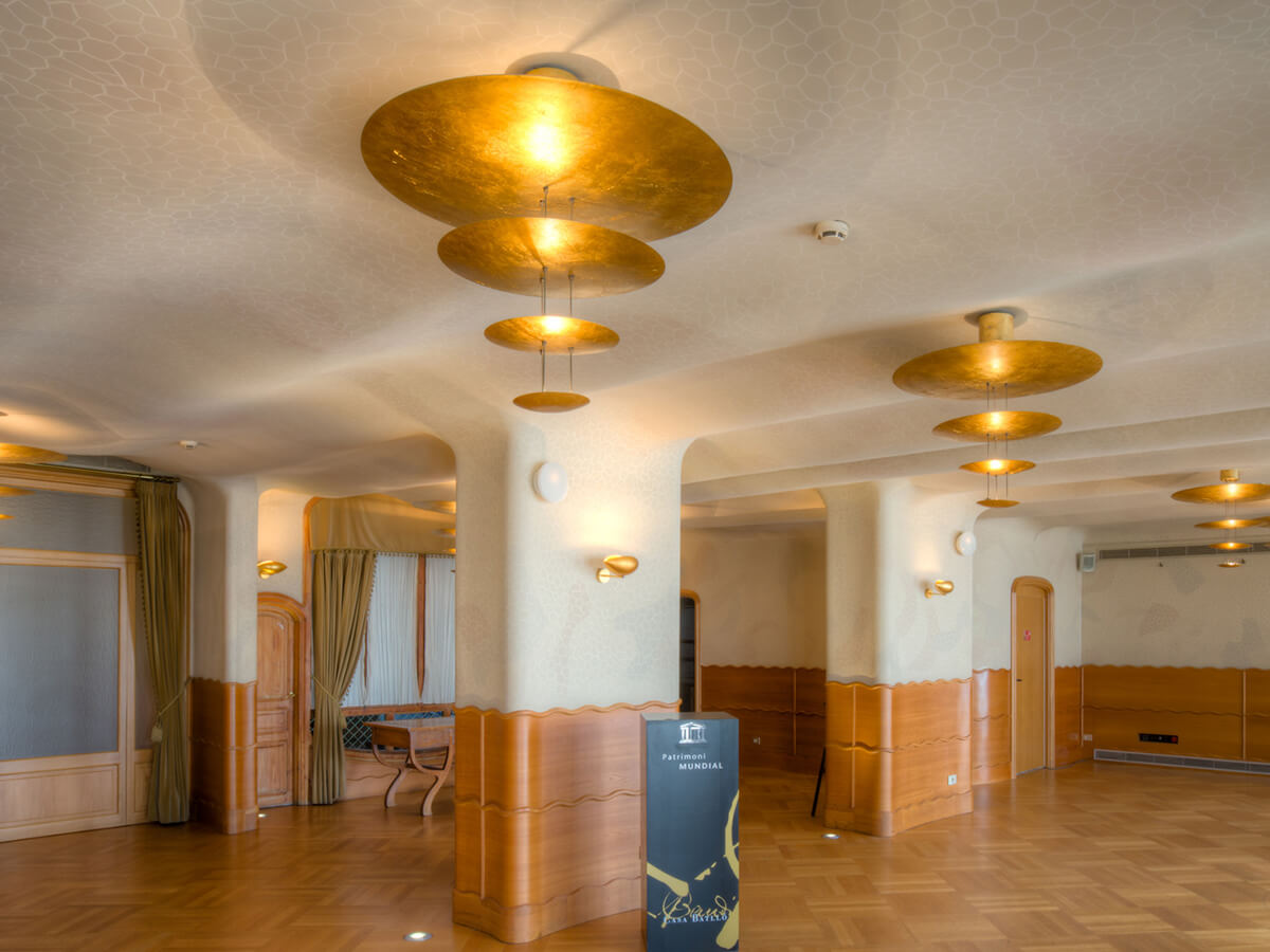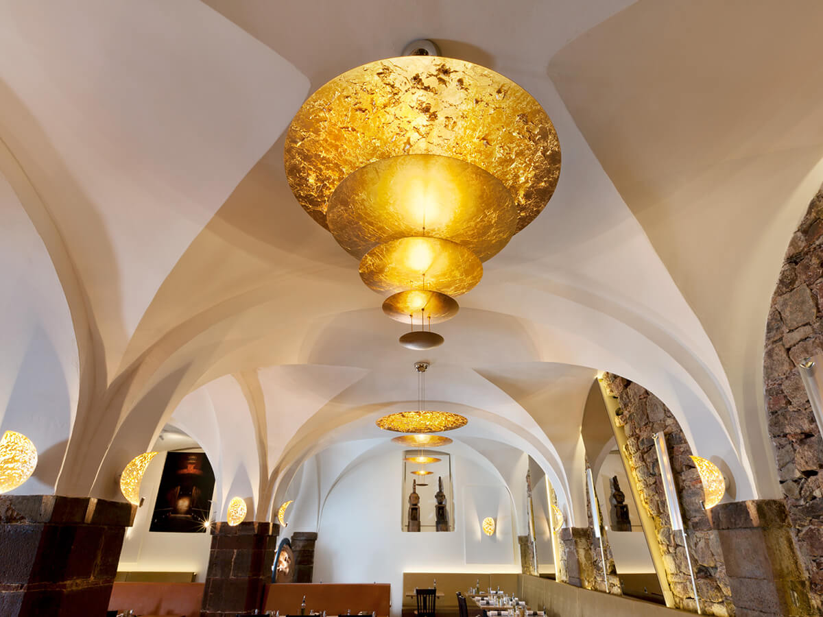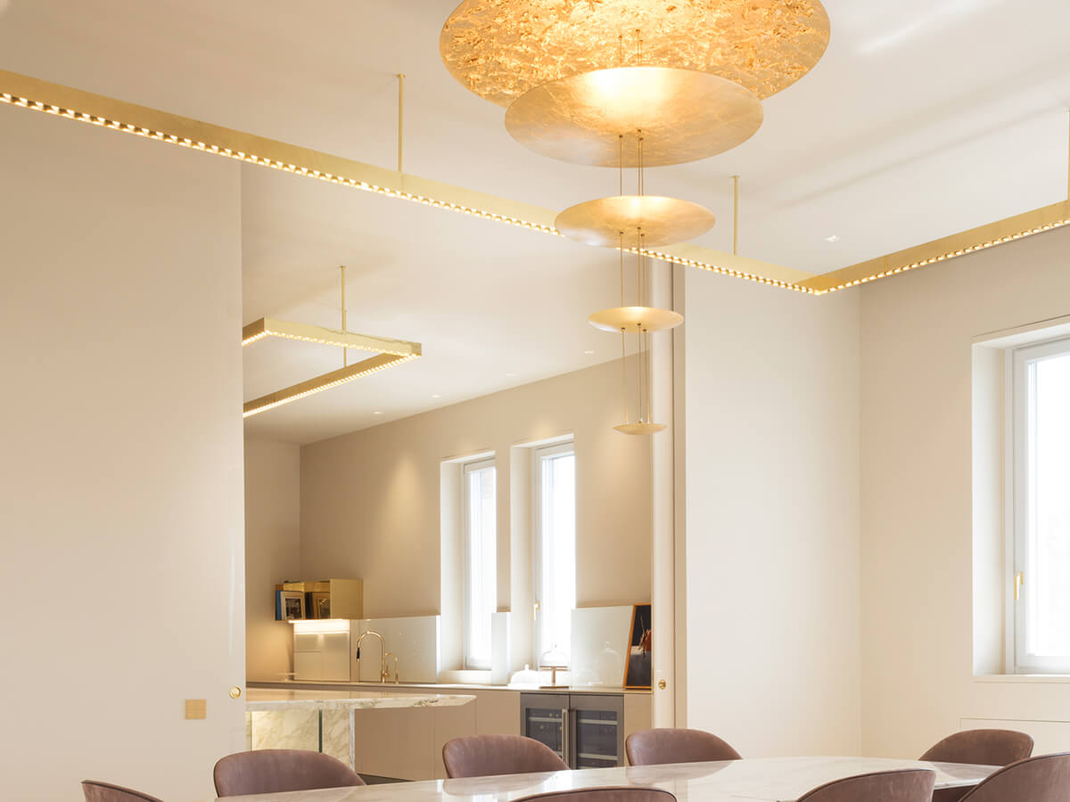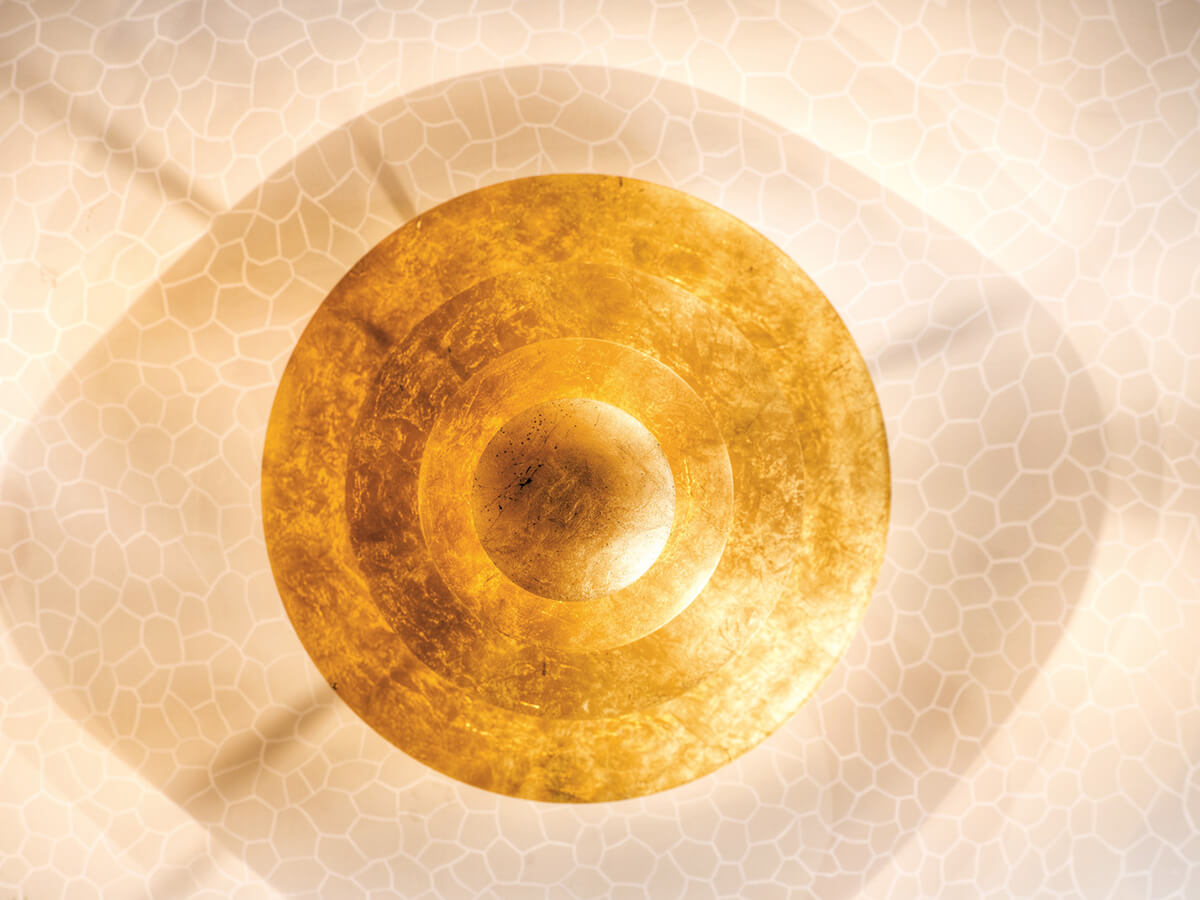 Preziosa e raffinata, questa lampada a sospensione che può raggiungere nelle sue varianti anche delle dimensioni spettacolari, arreda lo spazio in modo scenografico. Macchina della Luce prodotta da Catellani & Smith si compone di una base in nickel e di diversi dischi diffusori in alluminio interamente rivestiti in foglia, applicata a mano e disponibile nelle finiture oro, rame ed argento. Questo lavoro minuzioso dà vita ad una bella texture irregolare che gioca con i riflessi e la luce. Le sorgenti LED sono poste al di sopra dei dischi. La luce emessa è orientata verso l'alto poi riflessa sul disco superiore. I dischi sono montati su tre aste in ottone o alluminio. Le piccole imperfezioni non sono un difetto ma vanno considerate come una caratteristica del lavoro di grande artigianalità.