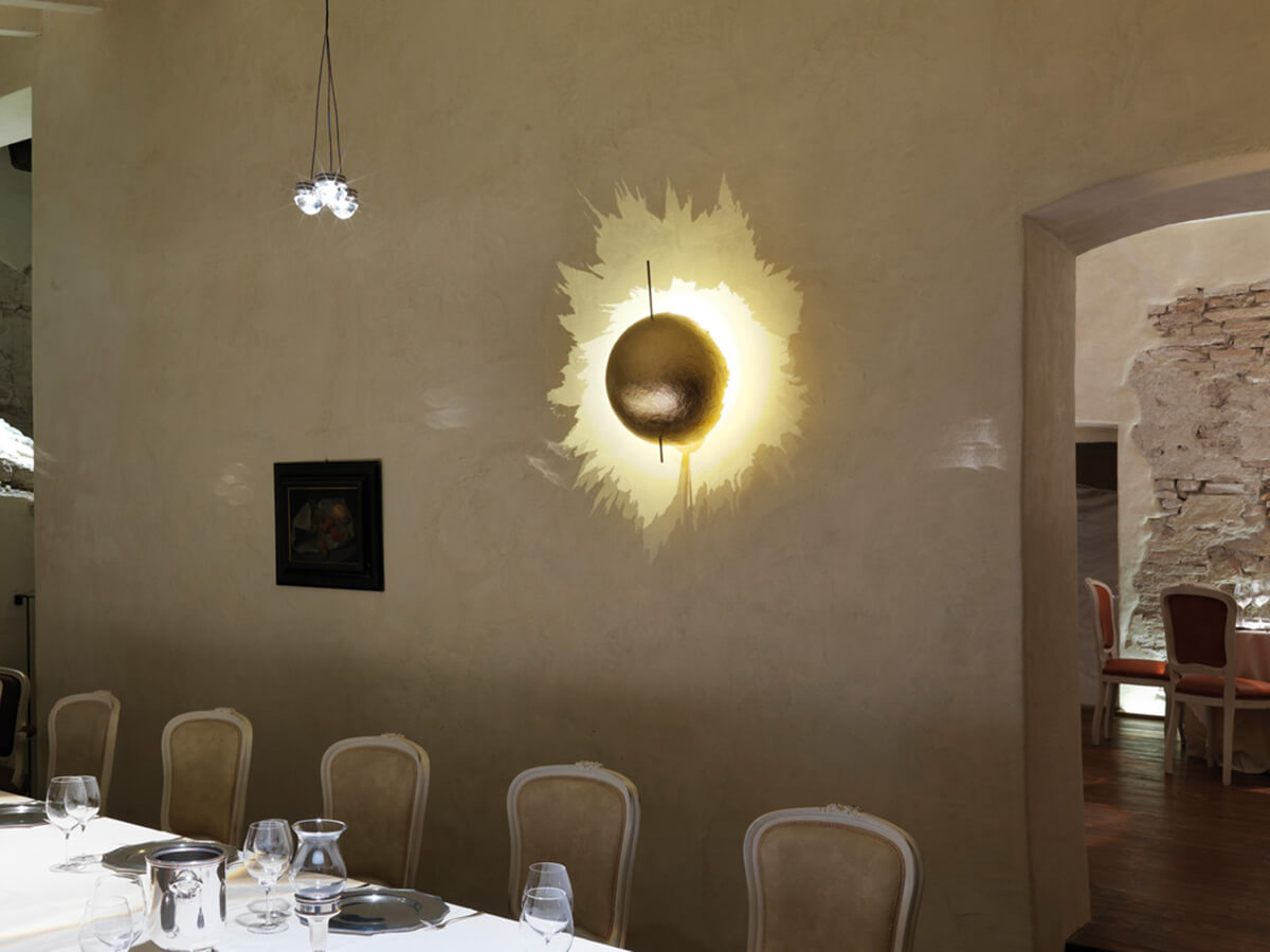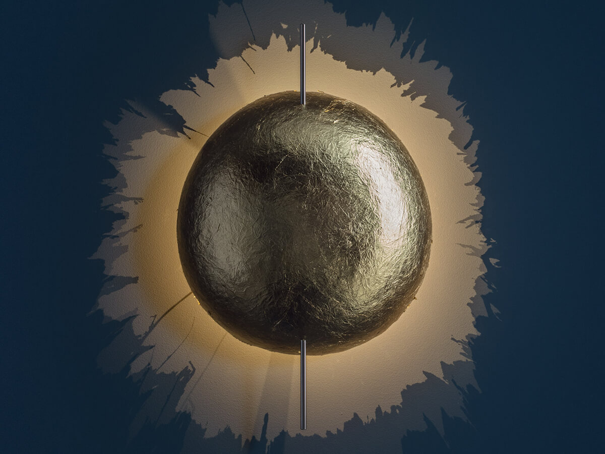 Una semisfera dal bordo irregolare, disponibile in tre diverse misure, caratterizza questa lampada da parete ideata da Enzo Catellani e prodotta da Catellani & Smith. Formata da una struttura e una base in metallo nichelato e da un diffusore in fiberglass, pensato nelle varianti rivestito a foglia oro, argento o bianco dipinto a mano, riassume in un’unica soluzione il design raffinato e la sapienza artigiana dove la sperimentazione su un materiale innovativo come la fibra di vetro si traduce in giochi di ombre e chiaroscuri di sicuro impatto emozionale ed estetico.