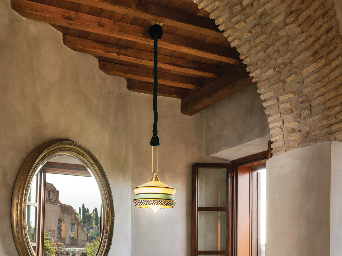 *Prezzo valido per la versione Antigua in ø 36 x H.271 cm con struttura in ottone satinato e corda in seta intrecciata verde muschio – paralume in tessuto colore Mint – lampadina esclusa (cod. ACAM.002019 – P45009).