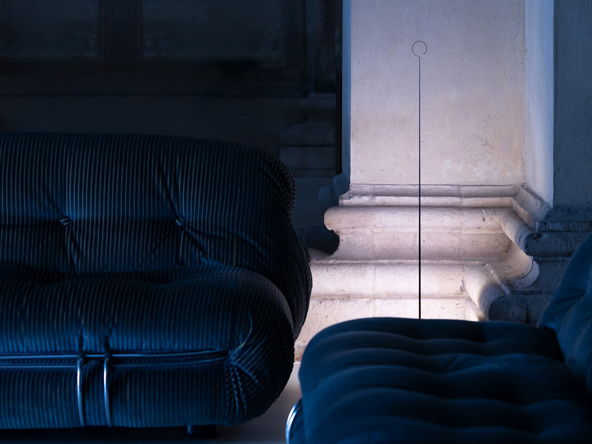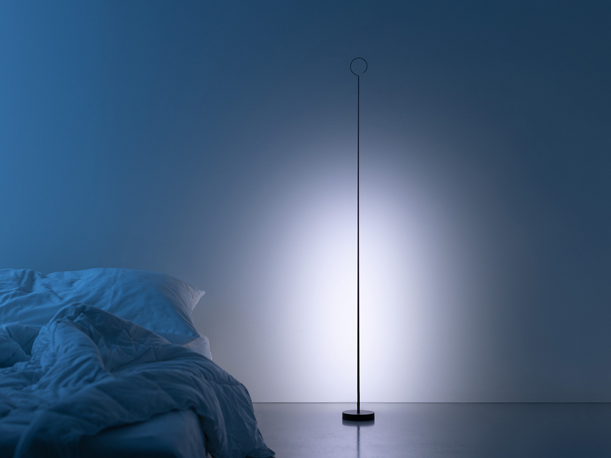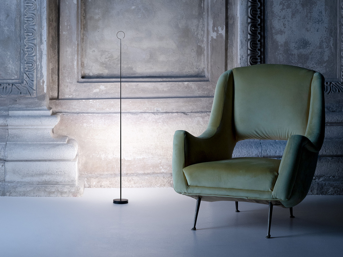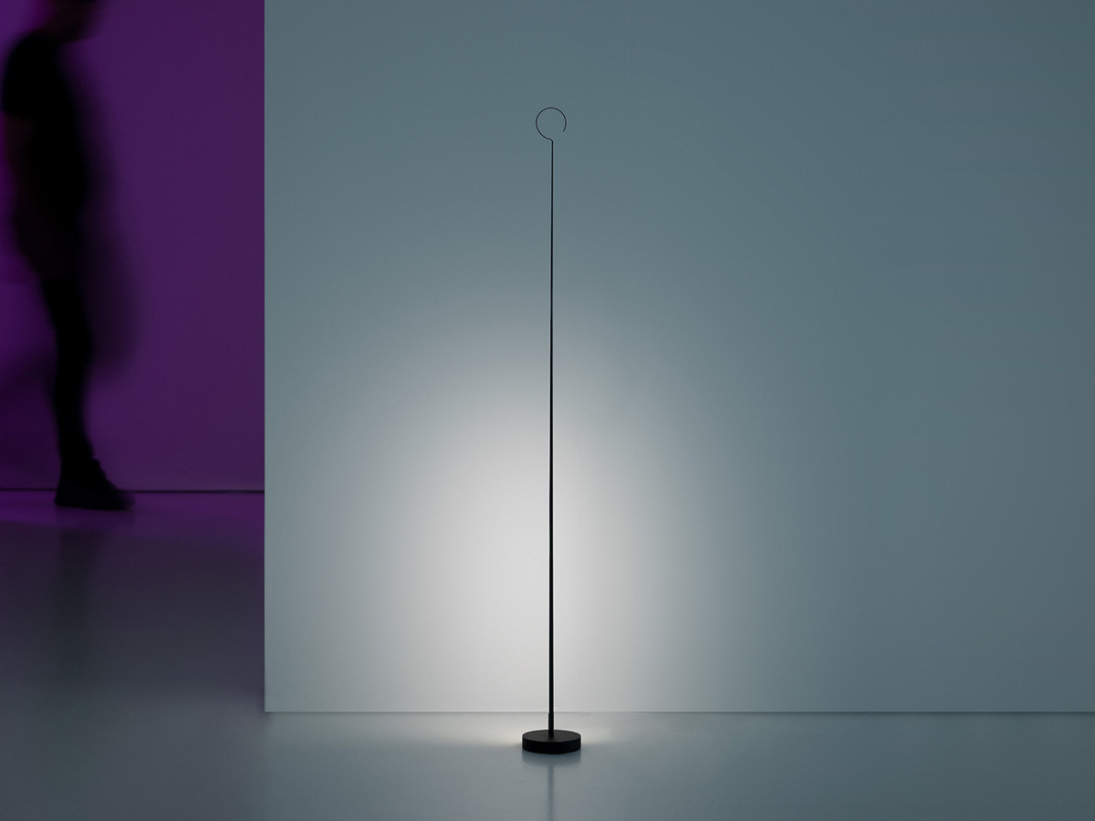 Come da nome, questa lampada di Davide Groppi ha in sé una certa aura ideale, un che di impalpabile che si evince prima di tutto dalla stessa linea della struttura che la definisce. Un unico elemento teso verso l’alto è infatti sorgente di luce e struttura al tempo stesso, un mix univoco che crea fra i due elementi una certa energia e commistione. La luce da qui propagata non è diretta, ma riflessa, stagliata contro qualunque superficie riflettente che diventa vero e proprio agente luminoso. Inutile dire che una simile prospettiva genera audaci possibilità per tutti coloro che amano sperimentare e creare qualcosa di nuovo. In cima si nota un cerchio non chiuso, simile a un amo per pescatori d’anime e sintomo di una incompletezza, di una ricerca che ognuno di noi compie mentre è in cerca di se stesso.