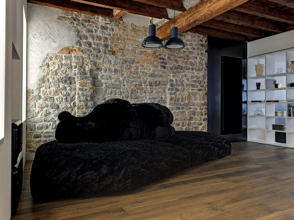 Edra si distingue nel panorama dell’arredo d’alta gamma per la sua capacità di creare pezzi iconici, particolari, di grande spicco. La loro capacità di uscire dal coro li rende particolarmente ambiti in qualunque contesto, sempre capaci di evadere le convenzioni. Pack rappresenta una banchina di giacchio come base. Un orso sdraiato su un fianco è invece utilizzato come schienale. La imbottitura della base garantisce massima morbidezza e resistenza all’uso prolungato. Anche lo schienale è morbido, realizzato in fibra di poliestere e rivestiti di pelliccia ecologica. Questo duo concede ampia personalizzazione non solo di colori e sfumature, ma anche collocazione. Lo schienale infatti non è fisso, ma è liberamente spostabile a seconda del gusto o della necessità.