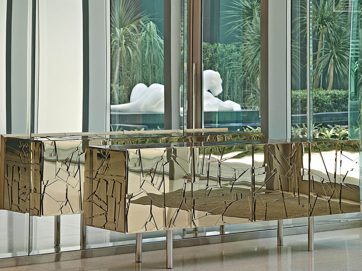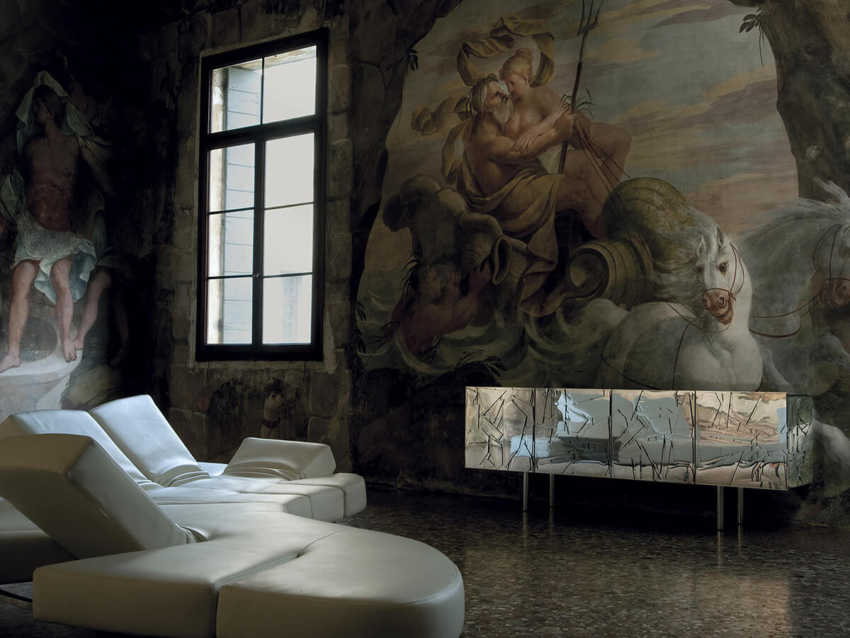 Un elemento d’arredo dal design peculiare, nato dallo stretto intreccio fra arte e design e finalizzato a meravigliare gli appassionati del settore. Scrigno è un contenitore la cui struttura esterna è in legno laccato con speciali vernici metallizzate, dello stesso colore dei rivestimenti esterni. Ognuna di queste superfici è ricoperta come da un mosaico di schegge di specchio, ognuna delle quali è in realtà un pezzo unico realizzato a mano. Scrigno è disponibile in diverse dimensioni, alte o basse, con ante e cassetti, e ognuna spicca nel panorama del catalogo Edra per la sua peculiare identità. Scrigno si adatta bene a qualunque tipo di ambiente, dallo spazio living alle zone notte, a seconda del gusto o delle necessità.